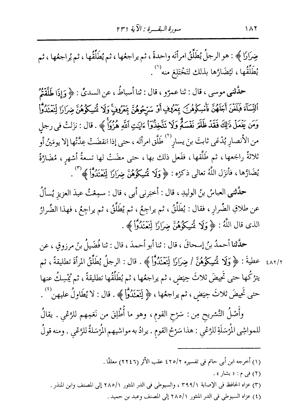 حَدَّثَنَا أَحْمَدُ بْنُ إِسْحَاقَ، قَالَ: ثنا أَبُو أَحْمَدَ، قَالَ: ثنا فُضَيْلُ بْنُ مَرْزُوقٍ، عَنْ عَطِيَّةَ: " {§وَلَا تُمْسِكُوهُنَّ ضِرَارًا لِتَعْتَدُوا} [البقرة: 231] قَالَ: الرَّجُلُ يُطَلِّقُ امْرَأَتَهُ تَطْلِيقَةً، ثُمَّ يَتْرُكُهَا حَتَّى تَحِيضَ ثَلَاثَ حِيَضٍ، ثُمَّ يُرَاجِعُهَا، ثُمَّ يُطَلِّقُهَا تَطْلِيقَةً، ثُمَّ يُمْسِكُ عَنْهَا حَتَّى تَحِيضَ ثَلَاثَ حِيَضٍ، ثُمَّ يُرَاجِعُهَا لِتَعْتَدُوا؛ قَالَ: لَا يُطَاوِلُ عَلَيْهِنَّ " وَأَصْلُ التَّسْرِيحِ مِنْ سَرَّحَ الْقَوْمَ، وَهُوَ مَا أُطْلِقَ مِنْ نَعَمِهِمْ لِلرَّعْيِ، يُقَالُ لِلْمَوَاشِي الْمُرْسَلَةِ لِلرَّعْيِ: هَذَا سَرَّحَ الْقَوْمُ، يُرَادُ بِهِ مَوَاشِيَهُمُ الْمُرْسَلَةَ لِلرَّعْيِ، وَمِنْهُ قَوْلُ