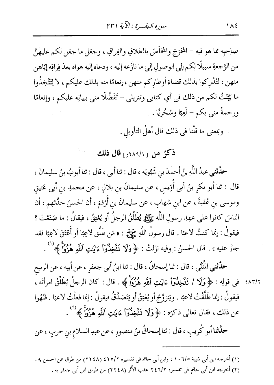 حَدَّثَنِي الْمُثَنَّى، قَالَ: ثنا إِسْحَاقُ، قَالَ: ثنا ابْنُ أَبِي جَعْفَرٍ، عَنْ أَبِيهِ، عَنِ الرَّبِيعِ، فِي قَوْلِهِ: " {§وَلَا تَتَّخِذُوا آيَاتِ اللَّهِ هُزُوًا} [البقرة: 231] قَالَ: كَانَ الرَّجُلُ يُطَلِّقُ امْرَأَتَهُ، فَيَقُولُ: إِنَّمَا طَلَّقْتُ لَاعِبًا، وَيَتَزَوَّجُ أَوْ يَعْتِقُ أَوْ يَتَصَدَّقُ فَيَقُولُ: إِنَّمَا فَعَلْتُ لَاعِبًا، فَنُهُوا عَنْ ذَلِكَ، فَقَالَ تَعَالَى ذِكْرُهُ: {وَلَا تَتَّخِذُوا آيَاتِ اللَّهِ هُزُوًا} [البقرة: 231] "