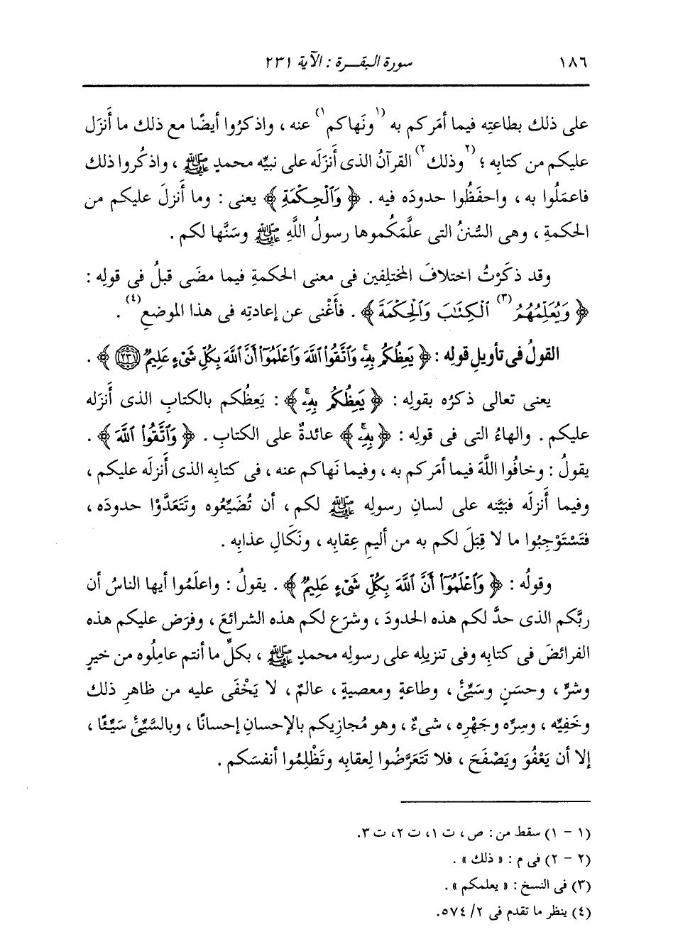 §الْقَوْلُ فِي تَأْوِيلِ قَوْلِهِ تَعَالَى: {يَعِظُكُمْ بِهِ وَاتَّقُوا اللَّهَ وَاعْلَمُوا أَنَّ اللَّهَ بِكُلِّ شَيْءٍ عَلِيمٌ} [البقرة: 231] يَعْنِي تَعَالَى ذِكْرُهُ بِقَوْلِهِ: {يَعِظُكُمْ بِهِ} [البقرة: 231] يَعِظُكُمْ بِالْكِتَابِ الَّذِي أَنْزَلَ عَلَيْكُمْ وَالْهَاءُ الَّتِي فِي قَوْلِهِ «بِهِ» عَائِدَةٌ عَلَى الْكِتَابِ {وَاتَّقُوا اللَّهَ} [البقرة: 189] يَقُولُ: وَخَافُوا اللَّهَ فِيمَا أَمَرَكُمْ بِهِ، وَفِيمَا نَهَاكُمْ عَنْهُ فِي كِتَابِهِ الَّذِي أَنْزَلَهُ عَلَيْكُمْ، وَفِيمَا أَنْزَلَهُ فَبَيَّنَهُ عَلَى لِسَانِ رَسُولِ اللَّهِ صَلَّى اللهُ عَلَيْهِ وَسَلَّمَ لَكُمْ أَنْ تُضَيِّعُوهُ وَتَتَعَدُّوا حُدُودَهُ، فَتَسْتَوْجِبُوا مَا لَا قِبَلَ لَكُمْ بِهِ مِنْ أَلِيمِ عِقَابِهِ، وَنَكَالِ عَذَابِهِ