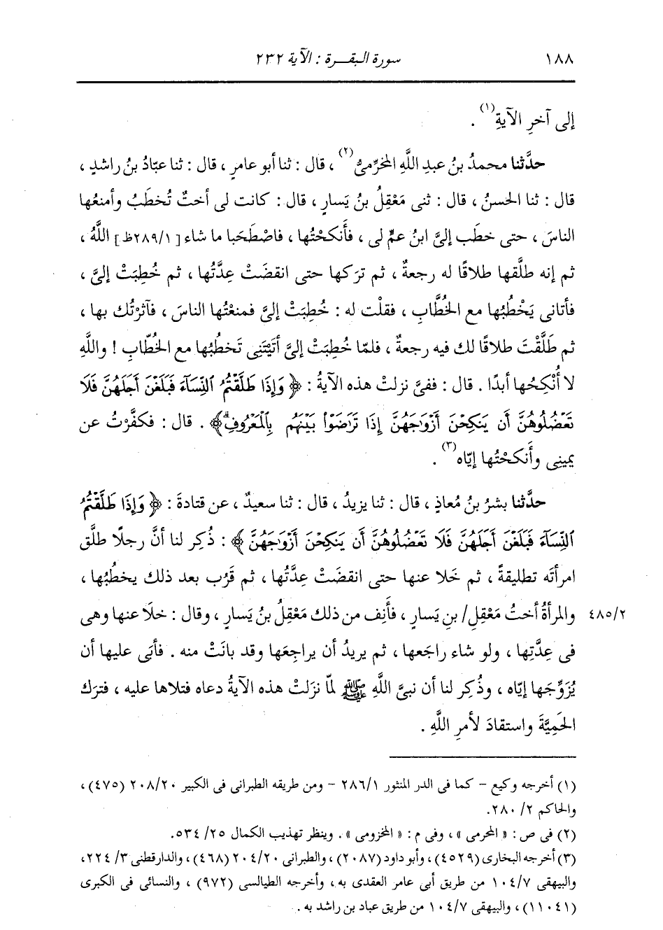 حَدَّثَنَا مُحَمَّدُ بْنُ عَبْدِ اللَّهِ الْمَخْزُومِيُّ، قَالَ: ثنا أَبُو عَامِرٍ، قَالَ: ثنا عَبَّادُ بْنُ رَاشِدٍ، قَالَ: ثنا الْحَسَنُ، قَالَ: ثني مَعْقِلُ بْنُ يَسَارٍ، قَالَ: " كَانَتْ لِي أُخْتٌ تُخْطَبُ وَأَمْنَعُهَا النَّاسَ، حَتَّى خَطَبَ إِلَيَّ ابْنُ عَمٍّ لِي فَأَنْكَحْتُهَا، فَاصْطَحَبَا مَا شَاءَ اللَّهُ، ثُمَّ إِنَّهُ طَلَّقَهَا طَلَاقًا لَهُ رَجْعَةَ، ثُمَّ تَرَكَهَا حَتَّى انْقَضَتْ عِدَّتُهَا، ثُمَّ خُطِبَتْ إِلَيَّ فَأَتَانِي يَخْطُبُهَا مَعَ الْخُطَّابِ، فَقُلْتُ لَهُ: خَطَبْتَ إِلَيَّ فَمَنَعْتُهَا النَّاسَ، فَآثَرْتُكَ بِهَا، ثُمَّ طَلَّقْتَ طَلَاقًا لَكَ فِيهِ رَجْعَةٌ، فَلَمَّا خُطِبَتْ إِلَيَّ آتَيْتَنِي تَخْطُبُهَا مَعَ الْخُطَّابِ؟ وَاللَّهِ لَا أَنْكِحُكُهَا أَبَدًا قَالَ: فَفِيَّ نَزَلَتْ هَذِهِ الْآيَةُ: {§وَإِذَا طَلَّقْتُمُ النِّسَاءَ فَبَلَغْنَ أَجَلَهُنَّ فَلَا تَعْضُلُوهُنَّ أَنْ يَنْكِحْنَ أَزْوَاجَهُنَّ إِذَا تَرَاضَوْا بَيْنَهُمْ بِالْمَعْرُوفِ} [البقرة: 232] قَالَ: فَكَفَّرْتُ عَنْ يَمِينِي وَأَنْكَحْتُهَا إِيَّاهُ "