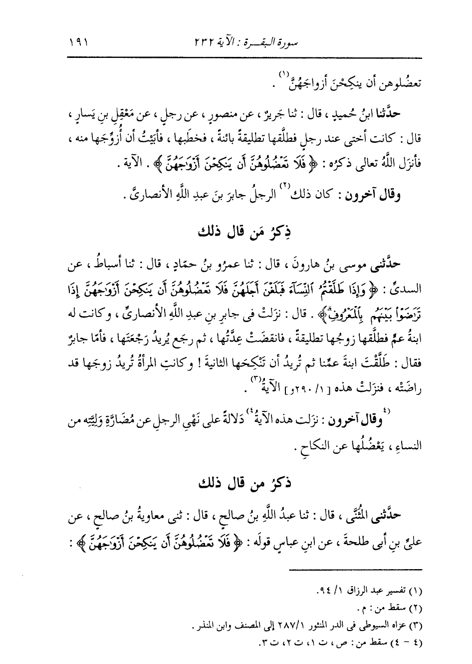 ذِكْرُ مَنْ قَالَ ذَلِكَ حَدَّثَنِي مُوسَى بْنُ هَارُونَ، قَالَ: ثنا عَمْرُو بْنُ حَمَّادٍ، قَالَ: ثنا أَسْبَاطٌ، عَنِ السُّدِّيِّ: " {§وَإِذَا طَلَّقْتُمُ النِّسَاءَ فَبَلَغْنَ أَجَلَهُنَّ فَلَا تَعْضُلُوهُنَّ أَنْ يَنْكِحْنَ أَزْوَاجَهُنَّ إِذَا تَرَاضَوْا بَيْنَهُمْ بِالْمَعْرُوفِ} [البقرة: 232] قَالَ: نَزَلَتْ فِي جَابِرِ بْنِ عَبْدِ اللَّهِ الْأَنْصَارِيِّ، وَكَانَتْ لَهُ ابْنَةُ عَمٍّ فَطَلَّقَهَا زَوْجُهَا تَطْلِيقَةً، فَانْقَضَتْ عِدَّتُهَا ثُمَّ رَجَعَ يُرِيدُ رَجْعَتَهَا، فَأَمَّا جَابِرٌ فَقَالَ: طَلَّقْتَ ابْنَةَ عَمِنْا ثُمَّ تُرِيدُ أَنْ تَنْكِحَهَا الثَّانِيَةَ وَكَانَتِ الْمَرْأَةُ تُرِيدُ زَوْجَهَا قَدْ رَاضَتْهُ، فَنَزَلَتْ هَذِهِ الْآيَةُ " وَقَالَ آخَرُونَ: نَزَلَتْ هَذِهِ الْآيَةُ دَلَالَةً عَلَى نَهْيِ الرَّجُلِ عَنْ مُضَارَّةِ وَلِيَّتِهِ مِنَ النِّسَاءِ، يَعْضُلُهَا عَنِ النِّكَاحِ