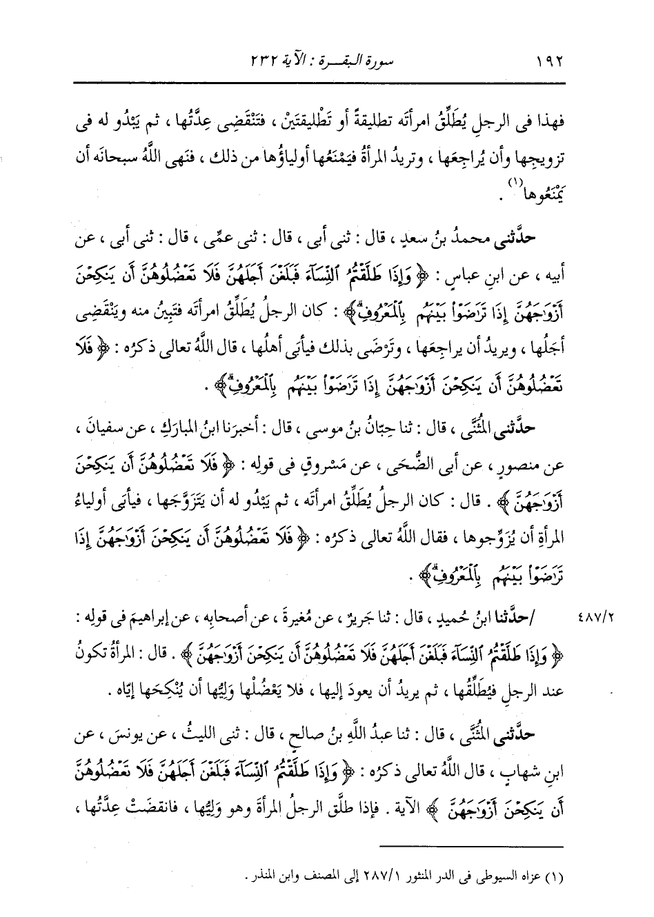 حَدَّثَنِي الْمُثَنَّى، قَالَ: ثنا حِبَّانُ بْنُ مُوسَى، قَالَ: أَخْبَرَنَا ابْنُ الْمُبَارَكِ، عَنْ سُفْيَانَ، عَنْ مَنْصُورٍ، عَنْ أَبِي الضُّحَى، عَنْ مَسْرُوقٍ، فِي قَوْلِهِ: " {§فَلَا تَعْضُلُوهُنَّ أَنْ يَنْكِحْنَ أَزْوَاجَهُنَّ} [البقرة: 232] قَالَ: كَانَ الرَّجُلُ يُطَلِّقُ امْرَأَتَهُ، ثُمَّ يَبْدُو لَهُ أَنْ يَتَزَوَّجَهَا، فَيَأْبَى أَوْلِيَاءُ الْمَرْأَةِ أَنْ يُزَوِّجُوهَا، فَقَالَ اللَّهُ تَعَالَى ذِكْرُهُ: {فَلَا تَعْضُلُوهُنَّ أَنْ يَنْكِحْنَ أَزْوَاجَهُنَّ إِذَا تَرَاضَوْا بَيْنَهُمْ بِالْمَعْرُوفِ} [البقرة: 232] "