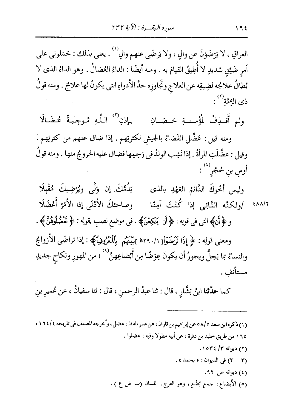 كَمَا حَدَّثَنَا ابْنُ بَشَّارٍ، قَالَ: ثنا عَبْدُ الرَّحْمَنِ، قَالَ: ثنا سُفْيَانُ، عَنْ عُمَيْرِ بْنِ -[195]- عَبْدِ اللَّهِ، عَنْ عَبْدِ الْمَلِكِ بْنِ الْمُغِيرَةِ، عَنْ عَبْدِ الرَّحْمَنِ بْنِ الْبَيْلَمَانِيِّ، قَالَ: قَالَ رَسُولُ اللَّهِ صَلَّى اللهُ عَلَيْهِ وَسَلَّمَ: «§أَنْكِحُوا الْأَيَامَى» فَقَالَ رَجُلٌ يَا رَسُولَ اللَّهِ مَا الْعَلَائِقُ بَيْنَهُمْ، قَالَ: «مَا تَرَاضَى عَلَيْهِ أَهْلُوهُمْ» حَدَّثَنَا ابْنُ بَشَّارٍ، قَالَ: ثنا مُحَمَّدُ بْنُ الْحَارِثِ، قَالَ: ثنا مُحَمَّدُ بْنُ عَبْدِ الرَّحْمَنِ بْنِ الْبَيْلَمَانِيِّ، عَنْ أَبِيهِ، عَنِ ابْنِ عُمَرَ، عَنِ النَّبِيِّ صَلَّى اللهُ عَلَيْهِ وَسَلَّمَ بِنَحْو مِنْهُ وَفِي هَذِهِ الْآيَةِ الدَّلَالَةُ الْوَاضِحَةُ عَلَى صِحَّةِ قَوْلِ مَنْ قَالَ: لَا نِكَاحَ إِلَّا بِوَلِيٍّ مِنَ الْعَصَبَةِ وَذَلِكَ أَنَّ اللَّهَ تَعَالَى ذِكْرُهُ مَنَعَ الْوَلِيَّ مِنْ عَضْلِ الْمَرْأَةِ إِنْ أَرَادَتِ النِّكَاحَ، وَنَهَاهُ عَنْ ذَلِكَ، فَلَوْ كَانَ لِلْمَرْأَةِ إِنْكَاحُ نَفْسِهَا بِغَيْرِ إِنْكَاحِ وَلِيِّهَا إِيَّاهَا، أَوْ كَانَ لَهَا تَوْلِيَةُ مَنْ أَرَادَتْ تَوْلِيَتَهُ فِي إِنْكَاحِهَا لَمْ يَكُنْ لِنَهْيِ وَلِيِّهَا عَنْ عَضْلِهَا مَعْنًى مَفْهُومٌ، إِذْ كَانَ لَا سَبِيلَ لَهُ إِلَى عَضْلِهَا، وَذَلِكَ أَنَّهَا إِنْ كَانَتْ مَتَى أَرَدَاتِ النِّكَاحَ جَازَ لَهَا إِنْكَاحُ نَفْسِهَا أَوِ إِنْكَاحُ مَنْ تُوَكِّلُهُ إِنْكَاحَهَا، فَلَا عَضْلَ هُنَالِكَ لَهَا مِنْ أَحَدٍ، فَيَنْهَى عَاضِلَهَا عَنْ عَضْلِهَا وَفِي فَسَادِ الْقَوْلِ بِأَنْ لَا مَعْنَى لِنَهْيِ اللَّهِ عَمَّا نَهَى عَنْهُ صِحَّةُ الْقَوْلِ بِأَنَّ لِوَلِيِّ الْمَرْأَةِ فِي تَزْوِيجِهَا حَقًّا لَا يَصِحُّ عَقْدُهُ إِلَّا بِهِ، وَهُوَ الْمَعْنَى الَّذِي أَمَرَ اللَّهُ بِهِ الْوَلِيَّ مِنْ تَزْوِيجِهَا إِذَا خَطَبَهَا خَاطِبُهَا وَرَضِيَتْ بِهِ، وَكَانَ رِضًى عِنْدَ أَوْلِيَائِهَا جَائِزًا فِي حُكْمِ الْمُسْلِمِينَ لِمِثْلِهَا أَنْ تُنْكَحَ مِثْلَهُ، وَنَهَاهُ عَنْ خِلَافِهِ مِنْ عَضْلِهَا، وَمَنْعِهَا عَمَّا أَرَادَتْ -[196]- مِنْ ذَلِكَ وَتَرَاضَتْ هِيَ وَالْخَاطِبُ بِهِ