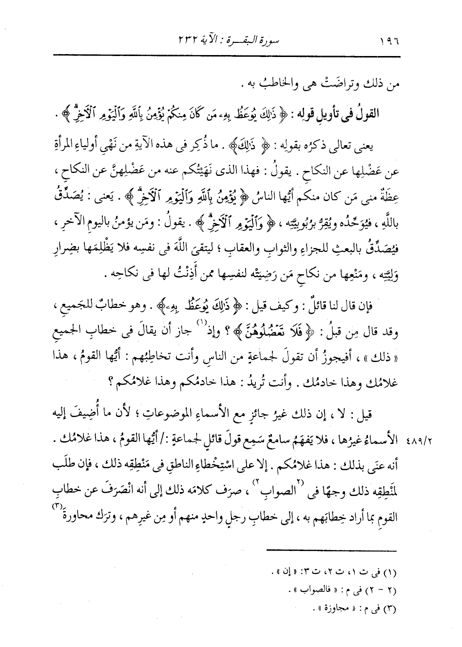 §الْقَوْلُ فِي تَأْوِيلِ قَوْلِهِ تَعَالَى: {ذَلِكَ يُوعَظُ بِهِ مَنْ كَانَ مِنْكُمْ يُؤْمِنُ بِاللَّهِ وَالْيَوْمِ الْآخِرِ} [البقرة: 232] يَعْنِي تَعَالَى ذِكْرُهُ بِقَوْلِهِ ذَلِكَ مَا ذُكِرَ فِي هَذِهِ الْآيَةِ: مِنْ نَهْيِ أَوْلِيَاءِ الْمَرْأَةِ عَنْ عَضْلِهَا عَنِ النِّكَاحِ؛ يَقُولُ: فَهَذَا الَّذِي نَهَيْتُكُمْ عَنْهُ مِنْ عَضْلِهِنَّ عَنِ النِّكَاحِ عِظَةٌ مِنِّي مَنْ كَانَ مِنْكُمْ أَيُّهَا النَّاسُ يُؤْمِنُ بِاللَّهِ وَالْيَوْمِ الْآخِرِ، " يَعْنِي يُصَدِّقُ بِاللَّهِ فَيُوَحِّدُهُ، وَيَقِرُّ بِرُبُوبِيَّتِهِ {وَالْيَوْمِ الْآخِرِ} [البقرة: 62] يَقُولُ: وَمَنْ يُؤْمِنُ بِالْيَوْمِ الْآخِرِ فَيُصَدِّقُ بِالْبَعْثِ لِلْجَزَاءِ وَالثَّوَابِ وَالْعِقَابِ، لِيَتَّقِيَ اللَّهَ فِي نَفْسِهِ، فَلَا يَظْلِمُهَا بِضَرَارِ وَلِيِّتِهِ، وَمَنْعِهَا مِنْ نِكَاحِ مَنْ رَضِيتَهُ لِنَفْسِهَا مِمَّنْ أَذِنَتْ لَهَا فِي نِكَاحِهِ فَإِنْ قَالَ لَنَا قَائِلٌ: وَكَيْفَ قِيلَ {ذَلِكَ يُوعَظُ بِهِ} [البقرة: 232] وَهُوَ خِطَابٌ لِلْجَمِيعِ، وَقَدْ قَالَ مِنْ قَبْلُ: {فَلَا تَعْضُلُوهُنَّ} [البقرة: 232] وَإِذَا جَازَ أَنْ يُقَالَ فِي خِطَابِ الْجَمِيعِ ذَلِكَ أَفَيَجُوزُ أَنْ تَقُولَ لِجَمَاعَةٍ مِنَ النَّاسِ وَأَنْتَ تُخَاطِبُهُمْ أَيُّهَا الْقَوْمُ: هَذَا غُلَامُكَ وَهَذَا خَادِمُكَ، وَأَنْتَ تُرِيدُ: هَذَا خَادِمُكُمْ وَهَذَا غُلَامُكُمْ؟ قِيلَ: لَا، إِنَّ ذَلِكَ غَيْرُ جَائِزٍ مَعَ الْأَسْمَاءِ الْمَوْضُوعَاتِ، لِأَنَّ مَا أُضِيفَ لَهُ الْأَسْمَاءُ غَيْرَهَا، فَلَا يَفْهَمُ سَامِعٌ سَمِعَ قَوْلَ قَائِلٍ لِجَمَاعَةٍ أَيُّهَا الْقَوْمُ هَذَا غُلَامُكَ، أَنَّهُ عَنَى بِذَلِكَ: هَذَا غُلَامُكُمْ، إِلَّا عَلَى اسْتِخْطَاءِ النَّاطِقِ فِي مَنْطِقِهِ ذَلِكَ، فَإِنْ طَلَبَ لِمَنْطِقِهِ ذَلِكَ وَجْهًا، فَالصَّوَابُ صَرْفُ كَلَامِهِ ذَلِكَ إِلَى أَنَّهُ انْصَرَفَ عَنْ خِطَابِ الْقَوْمِ بِمَا أَرَادَ خِطَابَهُمْ بِهِ إِلَى خِطَابِ رَجُلٍ وَاحِدٍ مِنْهُمْ أَوْ مِنْ غَيْرِهِمْ، وَتَرْكِ مُجَاوَزَةِ