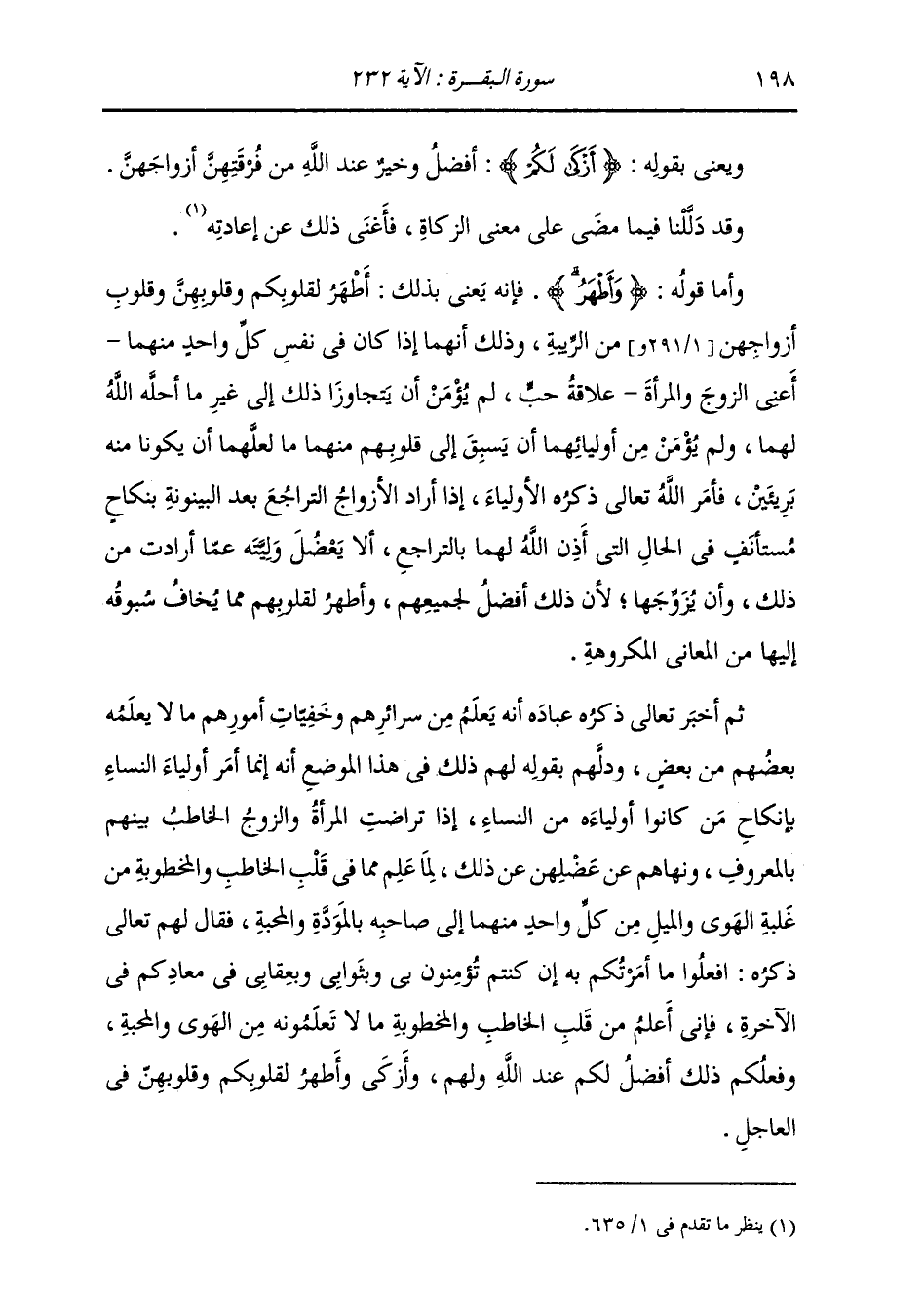 وَيَعْنِي بِقَوْلِهِ: {أَزْكَى لَكُمْ} [البقرة: 232] أَفْضَلُ وَخَيْرٌ عِنْدَ اللَّهِ مِنْ فُرْقَتِهِنَّ أَزْوَاجَهُنَّ وَقَدْ دَلَّلْنَا فِيمَا مَضَى عَلَى مَعْنَى الزَّكَاةِ، فَأَغْنَى ذَلِكَ عَنْ إِعَادَتِهِ وَأَمَّا قَوْلُهُ {وَأَطْهَرُ} [البقرة: 232] فَإِنَّهُ يَعْنِي بِذَلِكَ: أَطْهُرُ لِقُلُوبِكُمْ وَقُلُوبِهِنَّ وَقُلُوبِ أَزْوَاجِهِنَّ مِنَ الرِّيبَةِ، وَذَلِكَ أَنَّهُمَا إِذَا كَانَ فِي نَفْسِ كُلِّ وَاحِدٍ مِنْهُمَا أَعْنِي الزَّوْجَ وَالْمَرْأَةَ عَلَاقَةُ حُبٍّ، لَمْ يُؤْمَنْ أَنْ يَتَجَاوَزَا ذَلِكَ إِلَى غَيْرِ مَا أَحَلَّهُ اللَّهُ لَهُمَا، وَلَمْ يُؤْمَنْ مِنْ أَوْلِيَائِهِمَا أَنْ يَسْبِقَ إِلَى قُلُوبِهِمْ مِنْهُمَا مَا لَعَلَّهُمَا أَنْ يَكُونَا مِنْهُ بَرِيئَيْنِ فَأَمَرَ اللَّهُ تَعَالَى ذِكْرُهُ الْأَوْلِيَاءَ إِذَا أَرَادَ الْأَزْوَاجُ التَّرَاجُعَ بَعْدَ الْبَيْنُونَةِ بِنِكَاحٍ مُسْتَأْنَفٍ فِي الْحَالِ الَّتِي أَذِنَ اللَّهُ لَهُمَا بِالتَّرَاجُعِ أَنْ لَا يَعْضُلَ وَلِيَّتَهُ عَمَّا أَرَادَتْ مِنْ ذَلِكَ، وَأَنْ يُزَوِّجَهَا، لِأَنَّ ذَلِكَ أَفْضَلُ لِجَمِيعِهِمْ، وَأَطْهَرُ لِقُلُوبِهِمْ مِمَّا يُخَافُ سُبُوقُهُ إِلَيْهَا مِنَ الْمَعَانِي الْمَكْرُوهَةِ. ثُمَّ أَخْبَرَ تَعَالَى ذِكْرُهُ عِبَادَهُ أَنَّهُ يَعْلَمُ مِنْ سَرَائِرِهِمْ وَخَفِّيَاتِ أُمُورِهِمْ، مَا لَا يَعْلَمُهُ بَعْضُهُمْ مِنْ بَعْضٍ، وَدَلَّهُمْ بِقَوْلِهِ لَهُمْ ذَلِكَ فِي الْمَوْضِعِ أَنَّهُ إِنَّمَا أَمَرَ أَوْلِيَاءَ النِّسَاءِ بِإِنْكَاحِ مَنْ كَانُوا أَوْلِيَاءَهُ مِنَ النِّسَاءِ إِذَا تَراضَتِ الْمَرْأَةُ وَالزَّوْجُ الْخَاطِبُ بَيْنَهُمْ بِالْمَعْرُوفِ، وَنَهَاهُمْ عَنْ عَضْلِهِنَّ عَنْ ذَلِكَ لِمَا عُلِمَ مِمَّا فِي قَلْبِ الْخَاطِبِ وَالْمَخْطُوبِ مِنْ غَلَبَةِ الْهَوَى، وَالْمَيْلِ مِنْ كُلِّ وَاحِدٍ مِنْهُمَا إِلَى صَاحِبِهِ بِالْمَوَدَّةِ وَالْمَحَبَّةِ، فَقَالَ لَهُمْ تَعَالَى ذِكْرُهُ: افْعَلُوا مَا أَمَرْتُكُمْ بِهِ إِنْ كُنْتُمْ تُؤْمِنُونَ بِي وَبِثَوَابِي وَبِعِقَابِي فِي مَعَادِكُمْ فِي الْآخِرَةِ، فَإِنِّي أَعْلَمُ مِنْ قَلْبِ الْخَاطِبِ وَالْمَخْطُوبَةِ مَا لَا تَعْلَمُونَهُ مِنَ الْهَوَى وَالْمَحَبَّةِ، وَفِعْلُكُمْ ذَلِكَ أَفْضَلُ لَكُمْ عِنْدَ اللَّهِ وَلَهُمْ، وَأَزْكَى وَأَطْهَرُ لِقُلُوبِكُمْ وَقُلُوبِهِنَّ فِي الْعَاجِلِ