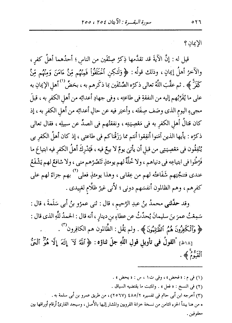 §الْقَوْلُ فِي تَأْوِيلِ قَوْلِهِ تَعَالَى: {اللَّهُ لَا إِلَهَ إِلَّا هُوَالْحَيُّ الْقَيُّومُ لَا تَأْخُذُهُ سِنَةٌ وَلَا نَوْمٌ لَهُ مَا فِي السَّمَوَاتِ وَمَا فِي الْأَرْضِ مَنْ ذَا الَّذِي يَشْفَعُ عِنْدَهُ إِلَّا بِإِذْنِهِ يَعْلَمُ مَا بَيْنَ أَيْدِيهِمْ وَمَا خَلْفَهُمْ وَلَا يُحِيطُونَ بِشَيْءٍ مِنْ عِلْمِهِ إِلَّا بِمَا شَاءَ وَسِعَ كُرْسِيُّهُ السَّمَوَاتِ وَالْأَرْضَ وَلَا يَئُودُهُ حِفْظُهُمَا وَهُوَ الْعَلِيُّ الْعَظِيمُ}