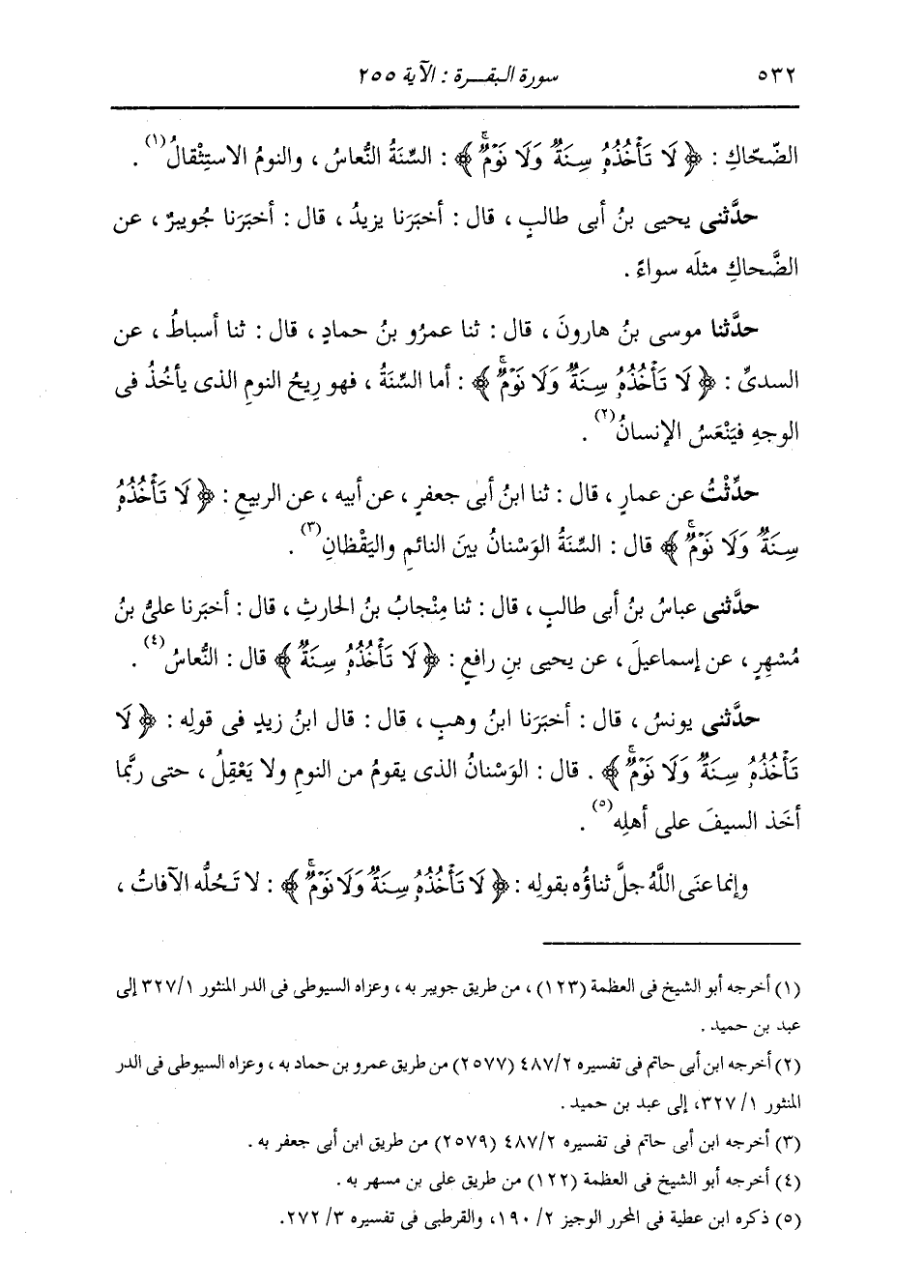 حَدَّثَنِي مُوسَى، قَالَ: ثنا عَمْرٌو، قَالَ: ثنا أَسْبَاطٌ، عَنِ السُّدِّيِّ: {§لَا تَأْخُذُهُ سِنَةٌ وَلَا نَوْمٌ} [البقرة: 255] أَمَّا سِنَةٌ: «فَهُوَ رِيحُ النَّوْمِ الَّذِي يَأْخُذُ فِي الْوَجْهِ فَيَنْعَسُ الْإِنْسَانُ»