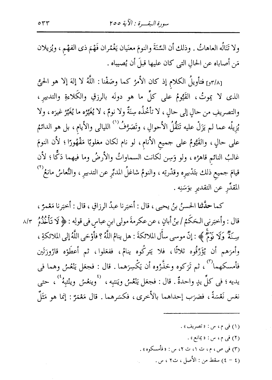 كَمَا: حَدَّثَنَا الْحَسَنُ بْنُ يَحْيَى، قَالَ: أَخْبَرَنَا عَبْدُ الرَّزَّاقِ، قَالَ: أَخْبَرَنَا مَعْمَرٌ، قَالَ: وَأَخْبَرَنِي الْحَكَمُ بْنُ أَبَانَ، عَنْ عِكْرِمَةَ، مَوْلَى ابْنِ عَبَّاسٍ فِي قَوْلِهِ: " {§لَا تَأْخُذُهُ سِنَةٌ وَلَا نَوْمٌ} [البقرة: 255] أَنَّ مُوسَى سَأَلَ الْمَلَائِكَةَ: هَلْ يَنَامُ اللَّهُ؟ فَأَوْحَى اللَّهُ إِلَى الْمَلَائِكَةِ، وَأَمَرَهُمْ أَنْ يُؤَرِّقُوهُ ثَلَاثًا فَلَا يَتْرُكُوهُ يَنَامُ، فَفَعَلُوا، ثُمَّ أَعْطُوهُ قَارُورَتَيْنِ فَأَمْسَكُوهُ، ثُمَّ تَرَكُوهُ وَحَذَّرُوهُ أَنْ يَكْسِرَهُمَا، قَالَ: فَجَعَلَ يَنْعَسُ وَهُمَا فِي يَدَيْهِ، فِي كُلِّ يَدٍ وَاحِدَةٌ. قَالَ: فَجَعَلَ يَنْعَسُ وَيَنْتَبِهُ، وَيَنْعَسُ وَيَنْتَبِهُ، حَتَّى نَعَسَ نَعْسَةً، فَضَرَبَ بِإِحْدَاهُمَا الْأُخْرَى فَكَسَرَهُمَا " قَالَ مَعْمَرٌ: إِنَّمَا هُوَ مَثَلٌ -[534]- ضَرَبَهُ اللَّهُ، يَقُولُ: فَكَذَلِكَ السَّمَاوَاتُ وَالْأَرْضُ فِي يَدَيْهِ