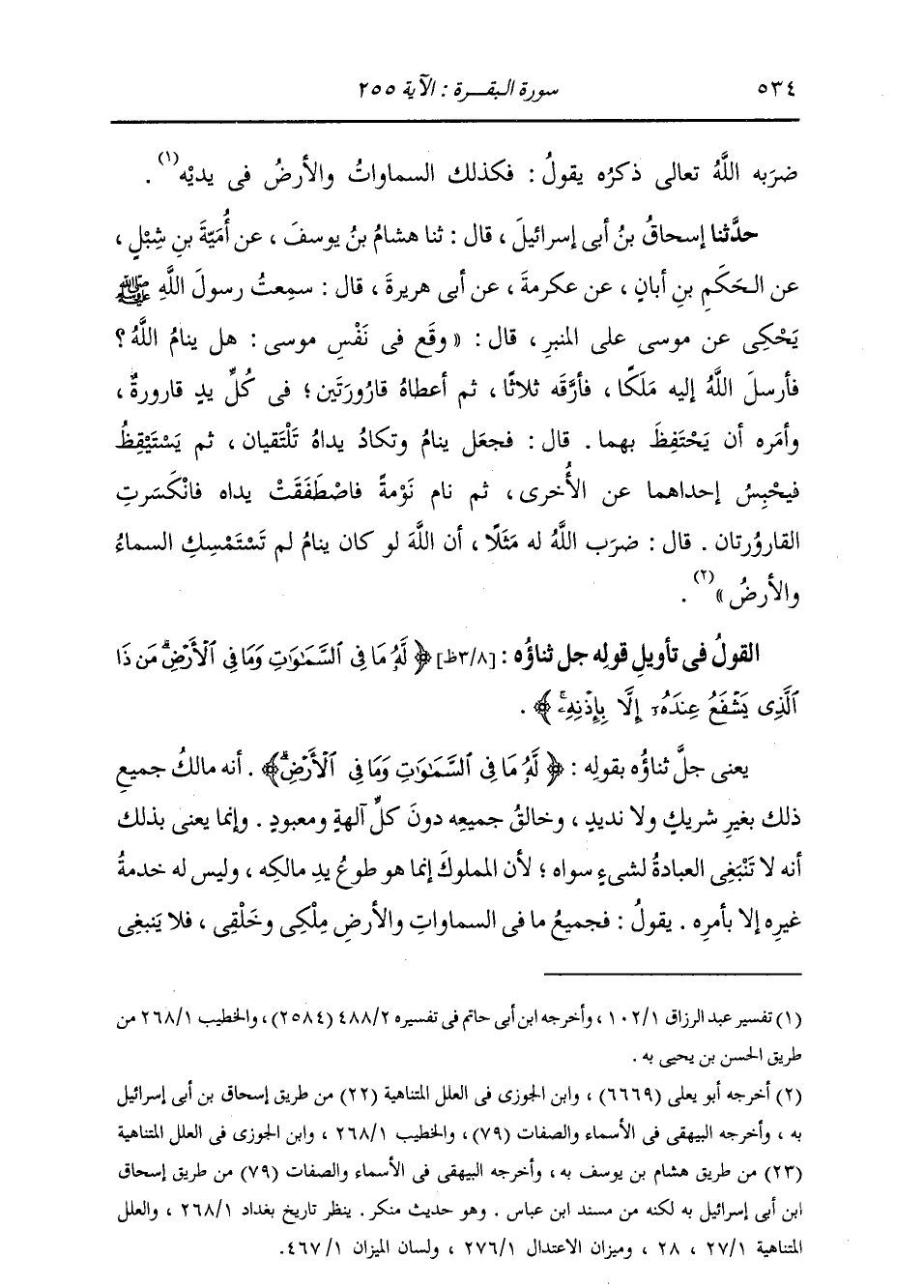 حَدَّثَنَا إِسْحَاقُ بْنُ أَبِي إِسْرَائِيلَ، قَالَ: ثنا هِشَامُ بْنُ يُوسُفَ، عَنْ أُمَيَّةَ بْنِ شِبْلٍ، عَنِ الْحَكَمِ بْنِ أَبَانَ، عَنْ عِكْرِمَةَ، عَنْ أَبِي هُرَيْرَةَ، قَالَ: سَمِعْتُ رَسُولَ اللَّهِ صَلَّى اللهُ عَلَيْهِ وَسَلَّمَ يَحْكِي عَنْ مُوسَى صَلَّى اللهُ عَلَيْهِ وَسَلَّمَ عَلَى الْمِنْبَرِ، قَالَ: «§وَقَعَ فِي نَفْسِ مُوسَى هَلْ يَنَامُ اللَّهُ تَعَالَى ذِكْرُهُ؟ فَأَرْسَلَ اللَّهُ إِلَيْهِ مَلَكًا فَأَرَّقَهُ ثَلَاثًا، ثُمَّ أَعْطَاهُ قَارُورَتَيْنِ، فِي كُلِّ يَدٍ قَارُورَةٌ، أَمَرَهُ أَنْ يَحْتَفِظَ بِهِمَا» قَالَ: «فَجَعَلَ يَنَامُ وَتَكَادُ يَدَاهُ تَلْتَقِيَانِ، ثُمَّ يَسْتَيْقِظُ فَيَحْبِسُ إِحْدَاهُمَا عَنِ الْأُخْرَى، ثُمَّ نَامَ نَوْمَةً فَاصْطَفَقَتْ يَدَاهُ وَانْكَسَرَتِ الْقَارُورَتَانِ» . قَالَ: «ضَرَبَ اللَّهُ مَثَلًا لَهُ، أَنَّ اللَّهَ لَوْ كَانَ يَنَامُ لَمْ تَسْتَمْسِكِ السَّمَاءُ وَالْأَرْضُ»
