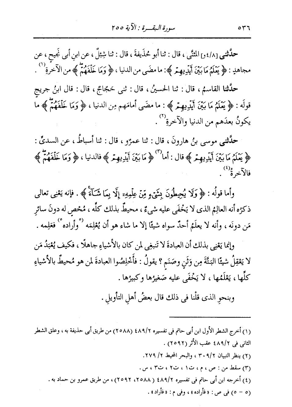 حَدَّثَنِي الْمُثَنَّى، قَالَ: ثنا أَبُو حُذَيْفَةَ، قَالَ: ثنا شِبْلٌ، عَنِ ابْنِ أَبِي نَجِيحٍ، عَنْ مُجَاهِدٍ: {§يَعْلَمُ مَا بَيْنَ أَيْدِيهِمْ} [البقرة: 255] " مَا مَضَى مِنَ الدُّنْيَا {وَمَا خَلْفَهُمْ} [البقرة: 255] مِنَ الْآخِرَةِ "