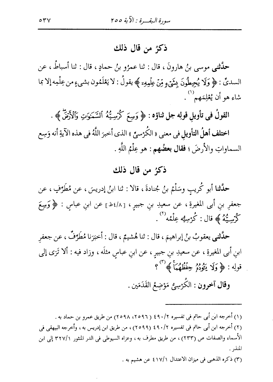 ذِكْرُ مَنْ قَالَ ذَلِكَ: حَدَّثَنَا أَبُو كُرَيْبٍ، وَسَلْمُ بْنُ جُنَادَةَ، قَالَا: ثنا ابْنُ إِدْرِيسَ، عَنْ مُطَرِّفٍ، عَنْ جَعْفَرِ بْنِ أَبِي الْمُغِيرَةِ، عَنْ سَعِيدِ بْنِ جُبَيْرٍ، عَنِ ابْنِ عَبَّاسٍ: {§وَسِعَ كُرْسِيُّهُ} [البقرة: 255] قَالَ: " كُرْسِيُّهُ: عِلْمُهُ " حَدَّثَنِي يَعْقُوبُ بْنُ إِبْرَاهِيمَ، قَالَ: ثنا هُشَيْمٌ، قَالَ: أَخْبَرَنَا مُطَرِّفٌ، عَنْ جَعْفَرِ بْنِ أَبِي الْمُغِيرَةِ، عَنْ سَعِيدِ بْنِ جُبَيْرٍ، عَنِ ابْنِ عَبَّاسٍ، مِثْلَهُ، وَزَادَ فِيهِ: أَلَا تَرَى إِلَى قَوْلِهِ: {وَلَا يَؤُودُهُ حِفْظُهُمَا} [البقرة: 255] وَقَالَ آخَرُونَ: الْكُرْسِيُّ: مَوْضِعُ الْقَدَمَيْنِ