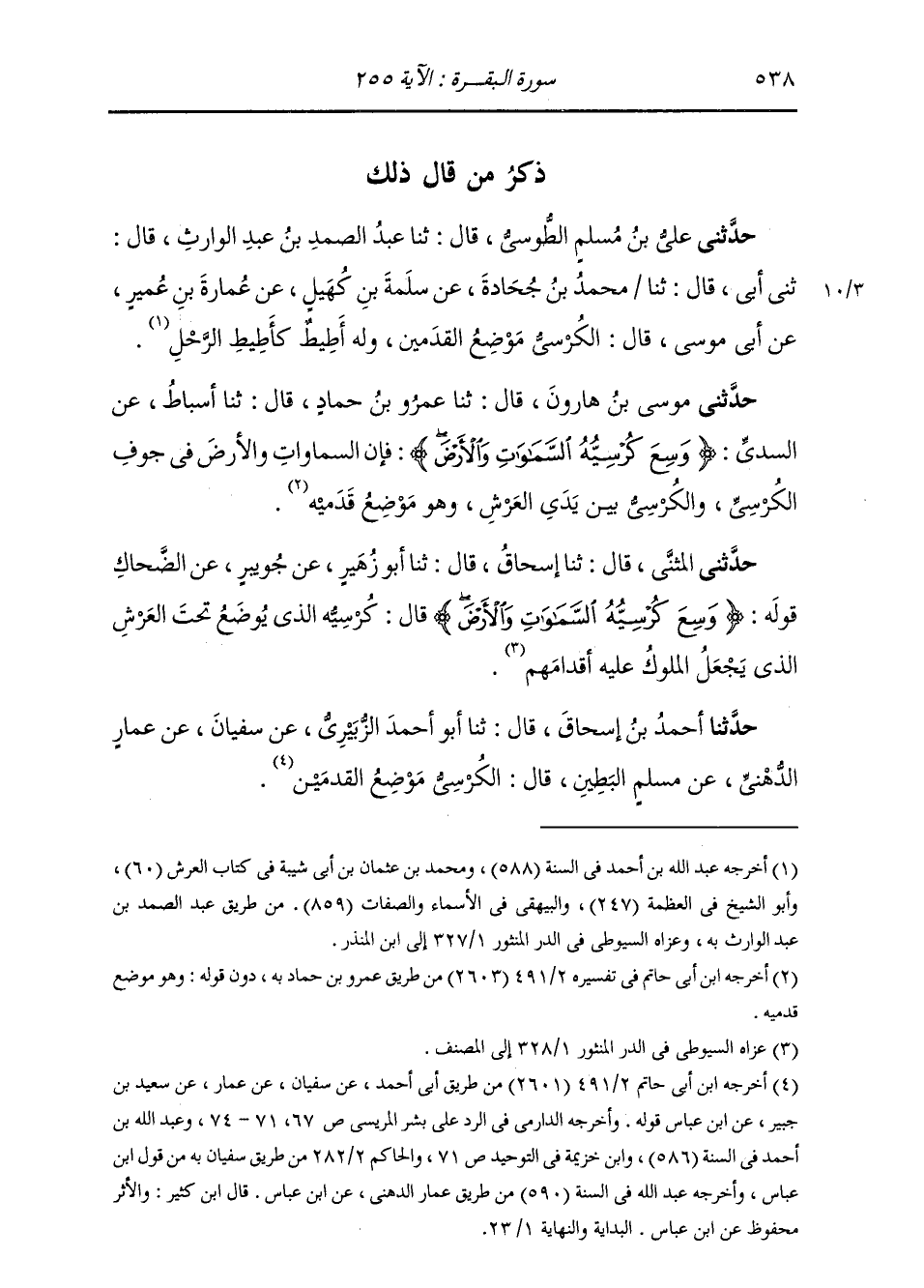ذِكْرُ مَنْ قَالَ ذَلِكَ: حَدَّثَنِي عَلِيُّ بْنُ مُسْلِمٍ الطُّوسِيُّ، قَالَ: ثنا عَبْدُ الصَّمَدِ بْنُ عَبْدِ الْوَارِثِ، قَالَ: ثني أَبِي، قَالَ: ثني مُحَمَّدُ بْنُ جُحَادَةَ، عَنْ سَلَمَةَ بْنِ كُهَيْلٍ، عَنْ عُمَارَةَ بْنِ عُمَيْرٍ، عَنْ أَبِي مُوسَى، قَالَ: " §الْكُرْسِيُّ: مَوْضِعُ الْقَدَمَيْنِ، وَلَهُ أَطِيطٌ كَأَطِيطِ الرَّحْلِ "