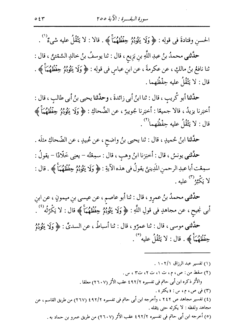 حَدَّثَنَا أَبُو كُرَيْبٍ، قَالَ: ثنا ابْنُ أَبِي زَائِدَةَ، وَحَدَّثنا يَحْيَى بْنُ أَبِي طَالِبٍ، قَالَ: أَخْبَرَنَا يَزِيدُ، قَالَا جَمِيعًا: أَخْبَرَنَا جُوَيْبِرٌ، عَنِ الضَّحَّاكِ: {§وَلَا يَئُودُهُ حِفْظُهُمَا} قَالَ: «لَا يَثْقُلُ عَلَيْهِ» حَدَّثَنَا ابْنُ حُمَيْدٍ، قَالَ: ثنا يَحْيَى بْنُ وَاضِحٍ، عَنْ عُبَيْدٍ، عَنِ الضَّحَّاكِ، مِثْلَهُ