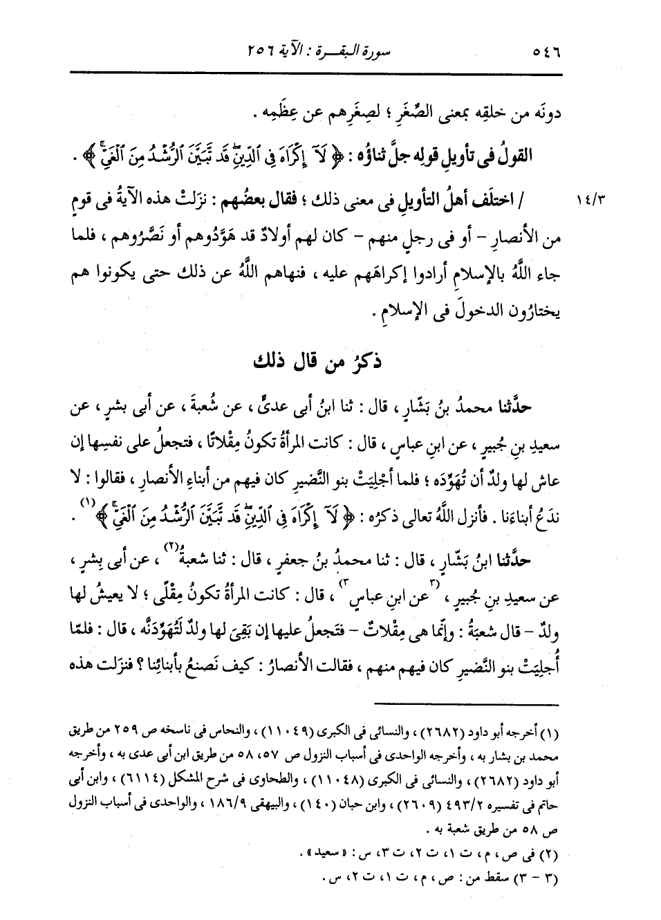 ذِكْرُ مَنْ قَالَ ذَلِكَ: حَدَّثَنَا مُحَمَّدُ بْنُ بَشَّارٍ، قَالَ: ثنا ابْنُ أَبِي عَدِيٍّ، عَنْ شُعْبَةَ، عَنْ أَبِي بِشْرٍ، عَنْ سَعِيدِ بْنِ جُبَيْرٍ، عَنِ ابْنِ عَبَّاسٍ، قَالَ: " §كَانَتِ الْمَرْأَةُ تَكُونُ مِقْلَاتًا، فَتَجْعَلُ عَلَى نَفْسِهَا إِنْ عَاشَ لَهَا وَلَدٌ أَنْ تُهَوِّدَهُ، فَلَمَّا أُجْلِيَتْ بَنُو النَّضِيرِ كَانَ فِيهِمْ مِنْ أَبْنَاءِ الْأَنْصَارِ، فَقَالُوا: لَا نَدَعُ أَبْنَاءَنَا، فَأَنْزَلَ اللَّهُ تَعَالَى ذِكْرُهُ: {لَا إِكْرَاهَ فِي الدِّينِ قَدْ تَبَيَّنَ الرُّشْدُ مِنَ الْغَيِّ} [البقرة: 256] "