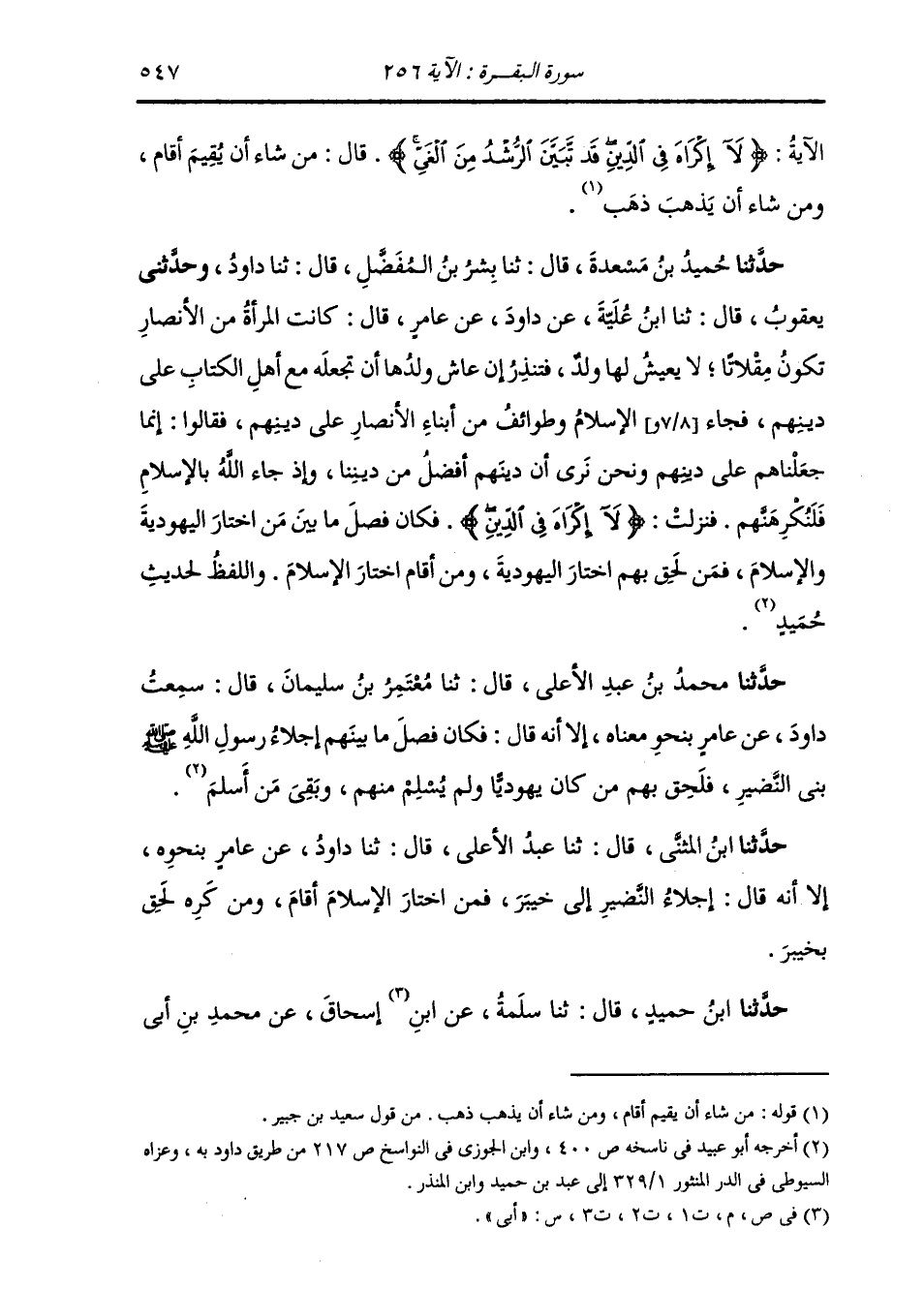 حَدَّثَنَا حُمَيْدُ بْنُ مَسْعَدَةَ، قَالَ: ثنا بِشْرُ بْنُ الْمُفَضَّلِ، قَالَ: ثنا دَاوُدُ، وَحَدَّثني يَعْقُوبُ، قَالَ: ثنا ابْنُ عُلَيَّةَ، عَنْ دَاوُدَ، عَنْ عَامِرٍ، قَالَ: " كَانَتِ §الْمَرْأَةُ مِنَ الْأَنْصَارِ تَكُونُ مِقْلَاتًا لَا يَعِيشُ لَهَا وَلَدٌ، فَتَنْذُرُ إِنْ عَاشَ وَلَدُهَا أَنْ تَجْعَلَهُ مَعَ أَهْلِ الْكِتَابِ عَلَى دِينِهِمْ، فَجَاءَ الْإِسْلَامُ وَطَوَائِفُ مِنْ أَبْنَاءِ الْأَنْصَارِ عَلَى دِينِهِمْ، فَقَالُوا: إِنَّمَا جَعَلْنَاهُمْ عَلَى دِينِهِمْ، وَنَحْنُ نَرَى أَنَّ دِينَهُمْ أَفْضَلُ مِنْ دِينِنَا، وَإِذْ جَاءَ اللَّهُ بِالْإِسْلَامِ فَلَنُكْرِهَنَّهُمْ فَنَزَلَتْ: {لَا إِكْرَاهَ فِي الدِّينِ} [البقرة: 256] فَكَانَ فَصْلَ مَا بَيْنَ مَنِ اخْتَارَ الْيَهُودِيَّةَ وَالْإِسْلَامَ، فَمَنْ لَحِقَ بِهِمُ اخْتَارَ الْيَهُودِيَّةَ، وَمَنْ أَقَامَ اخْتَارَ الْإِسْلَامَ وَلَفْظُ الْحَدِيثِ لِحُمَيْدٍ حَدَّثَنَا مُحَمَّدُ بْنُ عَبْدِ الْأَعْلَى، قَالَ: ثنا مُعْتَمِرُ بْنُ سُلَيْمَانَ، قَالَ: سَمِعْتُ دَاوُدَ، عَنْ عَامِرٍ، بِنَحْوِ مَعْنَاهُ، إِلَّا أَنَّهُ قَالَ: فَكَانَ فَصْلُ مَا بَيْنَهُمْ إِجْلَاءَ رَسُولِ اللَّهِ صَلَّى اللهُ عَلَيْهِ وَسَلَّمَ بَنِي النَّضِيرِ، فَلَحِقَ بِهِمْ مَنْ كَانَ يَهُودِيًّا وَلَمْ يُسْلِمْ مِنْهُمْ، وَبَقِيَ مَنْ أَسْلَمَ حَدَّثَنَا ابْنُ الْمُثَنَّى، قَالَ: ثنا عَبْدُ الْأَعْلَى، قَالَ: ثنا دَاوُدُ، عَنْ عَامِرٍ بِنَحْوِهِ، إِلَّا أَنَّهُ قَالَ: إِجْلَاءُ النَّضِيرِ إِلَى خَيْبَرَ، فَمَنِ اخْتَارَ الْإِسْلَامَ أَقَامَ، وَمَنْ كَرِهَ لَحِقَ بِخَيْبَرَ