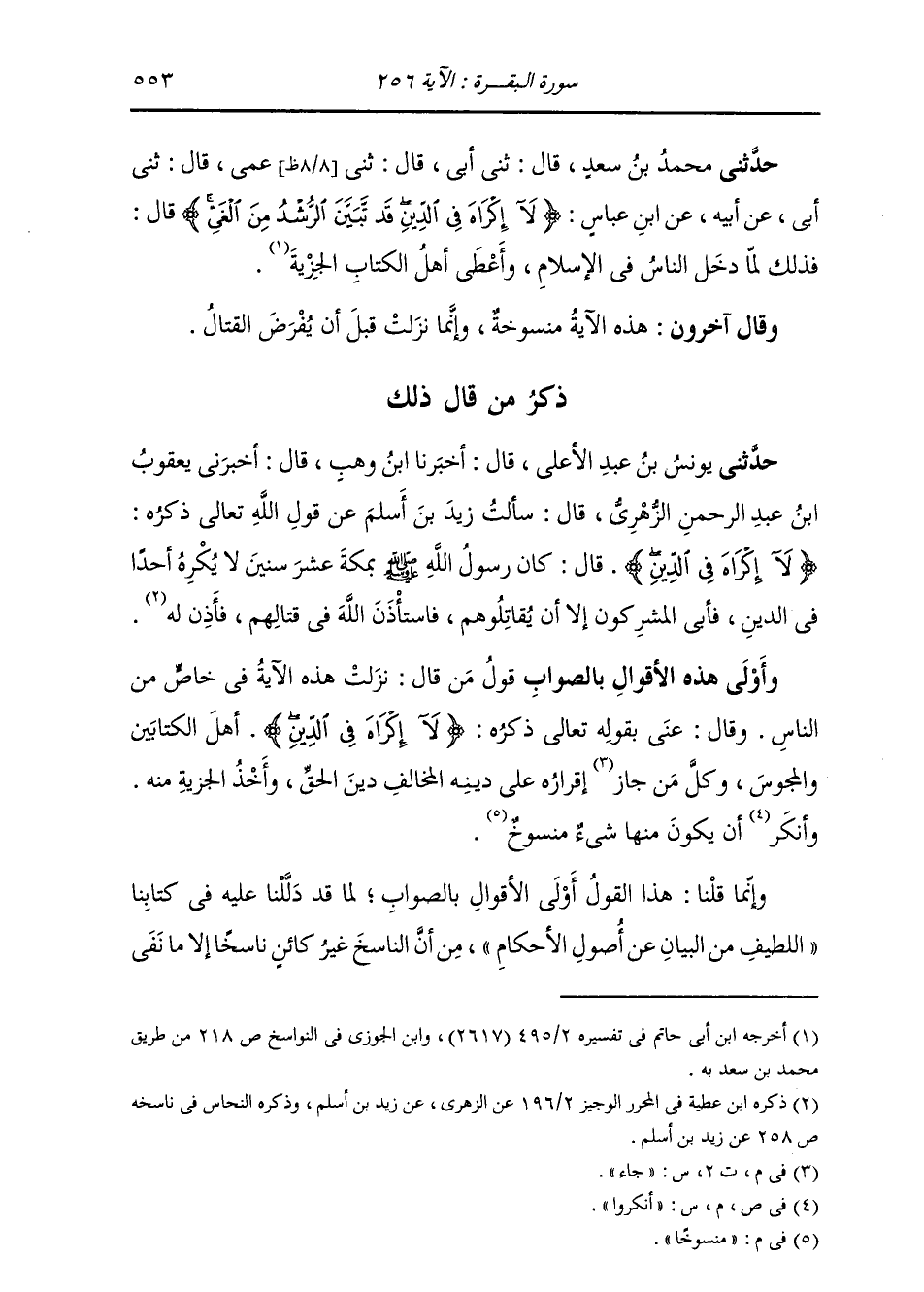 حَدَّثَنِي مُحَمَّدُ بْنُ سَعْدٍ، قَالَ: ثني أَبِي، قَالَ: ثني عَمِّي، قَالَ: ثني أَبِي، عَنْ أَبِيهِ، عَنِ ابْنِ عَبَّاسٍ: {§لَا إِكْرَاهَ فِي الدِّينِ قَدْ تَبَيَّنَ الرُّشْدُ مِنَ الْغَيِّ} [البقرة: 256] قَالَ: «وَذَلِكَ لَمَّا دَخَلَ النَّاسُ فِي الْإِسْلَامِ، وَأَعْطَى أَهْلُ الْكِتَابِ الْجِزْيَةَ» وَقَالَ آخَرُونَ: هَذِهِ الْآيَةُ مَنْسُوخَةٌ، وَإِنَّمَا نَزَلَتْ قَبْلَ أَنْ يُفْرَضَ الْقِتَالُ