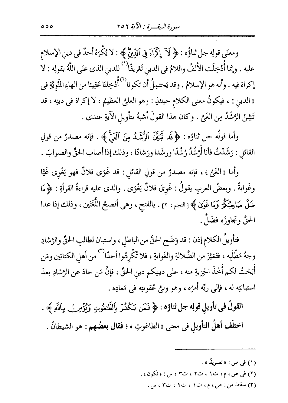 §وَأَمَّا قَوْلُهُ: {قَدْ تَبَيَّنَ الرُّشْدُ} [البقرة: 256] فَإِنَّهُ مَصْدَرٌ مِنْ قَوْلِ الْقَائِلِ: رَشَدْتُ فَأَنَا أَرْشُدُ رُشْدًا وَرِشْدًا وَرَشَادًا، وَذَلِكَ إِذَا أَصَابَ الْحَقَّ وَالصَّوَابَ، وَأَمَّا الْغَيُّ، فَإِنَّهُ مَصْدَرٌ مِنْ قَوْلِ الْقَائِلِ: قَدْ غَوَى فُلَانٌ فَهُوَ يَنْوِي غَيًّا وَغَوَايَةً، وَبَعْضُ الْعَرَبِ يَقُولُ: غَوَى فُلَانٌ يَغْوَى وَالَّذِي عَلَيْهِ قِرَاءَةُ الْقُرَّاءِ: {مَا ضَلَّ صَاحِبُكُمْ وَمَا غَوَى} [النجم: 2] الْفَتْحُ، وَهِيَ أَفْصَحُ اللُّغَتَيْنِ، وَذَلِكَ إِذَا عَدَا الْحَقَّ وَتَجَاوَزَهُ فَضَلَّ. فَتَأْوِيلُ الْكَلَامِ إِذًا: قَدْ وَضَحَ الْحَقُّ مِنَ الْبَاطِلِ، وَاسْتَبَانَ لِطَالِبِ الْحَقِّ وَالرَّشَادِ وَجْهُ مَطْلَبِهِ، فَتَمَيَّزَ مِنَ الضَّلَالَةِ وَالْغَوَايَةِ، فَلَا تُكْرِهُوا مِنْ أَهْلِ الْكِتَابَيْنِ، وَمَنْ أَبَحْتُ لَكُمْ أَخْذَ الْجِزْيَةِ مِنْهُ، عَلَى دِينِكُمْ دِينِ الْحَقِّ؛ فَإِنَّ مَنْ حَادَ عَنِ الرَّشَادِ بَعْدَ اسْتِبَانَتِهِ لَهُ، فَإِلَى رَبِّهِ أَمْرُهُ، وَهُوَ وَلِيُّ عُقُوبَتِهِ فِي مَعَادِهِ