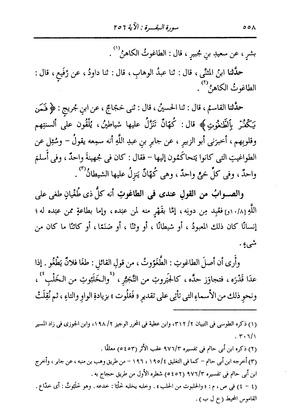 حَدَّثَنَا الْقَاسِمُ، قَالَ: ثنا الْحُسَيْنُ، قَالَ: ثني حَجَّاجٌ، عَنِ ابْنِ جُرَيْجٍ: {§فَمَنْ يَكْفُرْ بِالطَّاغُوتِ} [البقرة: 256] قَالَ: «كُهَّانٌ تَنْزِلُ عَلَيْهَا شَيَاطِينُ يُلْقُونَ عَلَى أَلْسِنَتِهِمْ وَقُلُوبِهِمْ» ، أَخْبَرَنِي أَبُو الزُّبَيْرِ، عَنْ جَابِرِ بْنِ عَبْدِ اللَّهِ أَنَّهُ سَمِعَهُ يَقُولُ: وَسُئِلَ عَنِ الطَّوَاغِيتِ الَّتِي كَانُوا يَتَحَاكَمُونَ إِلَيْهَا، فَقَالَ: «كَانَ فِي جُهَيْنَةَ وَاحِدٌ، وَفِي أَسْلَمَ وَاحِدٌ، وَفِي كُلِّ حَيٍّ وَاحِدٌ، وَهِيَ كُهَّانٌ يَنْزِلُ عَلَيْهَا الشَّيْطَانُ» وَالصَّوَابُ مِنَ الْقَوْلِ عِنْدِي فِي الطَّاغُوتِ أَنَّهُ كُلُّ ذِي طُغْيَانٍ عَلَى اللَّهِ فَعُبِدَ مِنْ دُونِهِ، إِمَّا بِقَهْرٍ مِنْهُ لِمَنْ عَبَدَهُ، وَإِمَّا بِطَاعَةٍ مِمَّنْ عَبَدَهُ لَهُ، وَإِنَسَانًا كَانَ ذَلِكَ الْمَعْبُودُ، أَوْ شَيْطَانًا، أَوْ وَثنا، أَوْ صَنَمًا، أَوْ كَائِنًا مَا كَانَ مِنْ شَيْءٍ. وَأَرَى أَنَّ أَصْلَ الطَّاغُوتِ: الطَّغْوُوتُ، مِنْ قَوْلِ الْقَائِلِ: طَغَا فُلَانٌ يَطْغَى: إِذَا عَدَا قَدْرَهُ فَتَجَاوَزَ حَدَّهُ، كَالْجَبَرُوتِ مِنَ التَّجَبُّرِ، وَالْخَلَبُوتِ مِنَ الْخَلْبِ، وَنَحْوِ ذَلِكَ مِنَ الْأَسْمَاءِ الَّتِي تَأْتِي عَلَى تَقْدِيرِ فَعَلُوتٍ بِزِيَادَةِ الْوَاوِ وَالتَّاءِ، ثُمَّ نُقِلَتْ