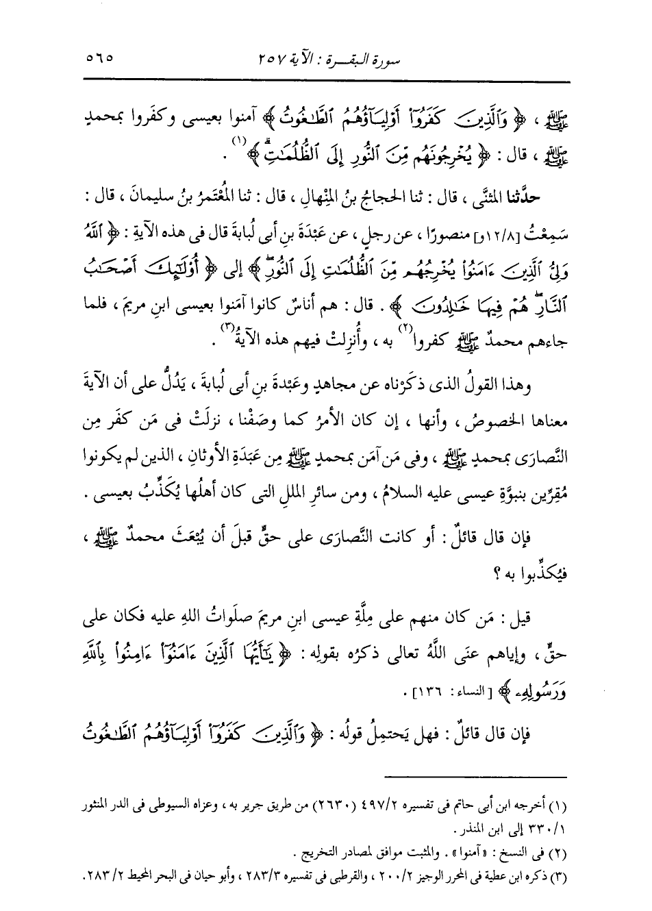 حَدَّثَنَا الْمُثَنَّى، قَالَ: ثنا الْحَجَّاجُ بْنُ الْمِنْهَالِ، قَالَ: ثنا الْمُعْتَمِرُ بْنُ سُلَيْمَانَ، قَالَ: سَمِعْتُ مَنْصُورًا، عَنْ رَجُلٍ، عَنْ عَبْدَةَ بْنِ أَبِي لُبَابَةَ، قَالَ فِي هَذِهِ الْآيَةِ: {§اللَّهُ وَلِيُّ الَّذِينَ آمَنُوا يُخْرِجُهُمْ مِنَ الظُّلُمَاتِ إِلَى النُّورِ} [البقرة: 257] إِلَى: {أُولَئِكَ أَصْحَابُ النَّارِ هُمْ فِيهَا خَالِدُونَ} [البقرة: 39] قَالَ: «هُمُ الَّذِينَ كَانُوا آمَنُوا بِعِيسَى ابْنِ مَرْيَمَ، فَلَمَّا جَاءَهُمْ مُحَمَّدٌ صَلَّى اللهُ عَلَيْهِ وَسَلَّمَ آمَنُوا بِهِ، وَأُنْزِلَتْ فِيهِمْ هَذِهِ الْآيَةُ» وَهَذَا الْقَوْلُ الَّذِي ذَكَرْنَاهُ عَنْ مُجَاهِدٍ وَعَبْدَةَ بْنِ أَبِي لُبَابَةَ يَدُلُّ عَلَى أَنَّ الْآيَةَ مَعْنَاهَا الْخُصُوصُ، وَأَنَّهَا إِنْ كَانَ الْأَمْرُ كَمَا وَصَفْنَا نَزَلَتْ فِيمَنْ كَفَرَ مِنَ النَّصَارَى بِمُحَمَّدٍ صَلَّى اللهُ عَلَيْهِ وَسَلَّمَ، وَفِيمَنْ آمَنَ بِمُحَمَّدٍ صَلَّى اللهُ عَلَيْهِ وَسَلَّمَ مِنْ عَبْدَةِ الْأَوْثَانِ الَّذِينَ لَمْ يَكُونُوا مُقِرِّينَ بِنُبُوَّةِ عِيسَى وَسَائِرِ الْمِلَلِ الَّتِي كَانَ أَهْلُهَا تُكَذِّبُ بِعِيسَى. فَإِنْ قَالَ قَائِلٌ: أَوَ كَانَتِ النَّصَارَى عَلَى حَقٍّ قَبْلَ أَنْ يُبْعَثَ مُحَمَّدٌ صَلَّى اللهُ عَلَيْهِ وَسَلَّمَ، فَكَذَّبُوا بِهِ؟ قِيلَ: مَنْ كَانَ مِنْهُمْ عَلَى مِلَّةِ عِيسَى ابْنِ مَرْيَمَ صَلَّى اللهُ عَلَيْهِ وَسَلَّمَ فَكَانَ عَلَى حَقٍّ وَإِيَّاهُمْ عَنَى اللَّهُ تَعَالَى ذِكْرُهُ بِقَوْلِهِ: {يَا أَيُّهَا الَّذِينَ آمَنُوا آمِنُوا بِاللَّهِ وَرَسُولِهِ} [النساء: 136] فَإِنْ قَالَ قَائِلٌ: فَهَلْ يُحْتَمَلُ أَنْ يَكُونَ قَوْلُهُ: {وَالَّذِينَ كَفَرُوا أَوْلِيَاؤُهُمُ الطَّاغُوتُ