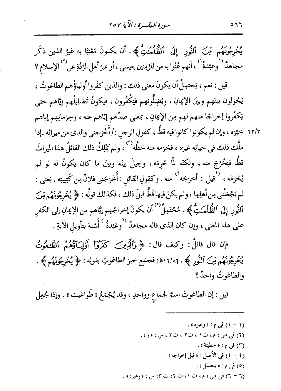 يُخْرِجُونَهُمْ مِنَ النُّورِ إِلَى الظُّلُمَاتِ} [البقرة: 257] أَنْ يَكُونَ مَعْنِيًّا بِهِ غَيْرُ الَّذِينَ ذَكَرَ مُجَاهِدٌ وَغَيْرُهُ أَنَّهُمْ عُنُوا بِهِ مِنَ الْمُؤْمِنِينَ بِعِيسَى أَوْ غَيْرُ أَهْلِ الرِّدَّةِ وَالْإِسْلَامِ؟ قِيلَ: نَعَمْ يُحْتَمَلُ أَنْ يَكُونَ مَعْنَى ذَلِكَ: وَالَّذِينَ كَفَرُوا أَوْلِيَاؤُهُمُ الطَّاغُوتُ يَحُولُونَ بَيْنَهُمْ وَبَيْنَ الْإِيمَانِ، وَيُضِلُّونَهُمْ فَيَكْفُرُونَ، فَيَكُونُ تَضْلِيلُهُمْ إِيَّاهُمْ حَتَّى يَكْفُرُوا إِخْرَاجًا مِنْهُمْ لَهُمْ مِنَ الْإِيمَانِ، يَعْنِي صَدُّهُمْ إِيَّاهُمْ عَنْهُ وَحِرْمَانَهُمْ إِيَّاهُمْ خَيْرَهُ، وَإِنْ لَمْ يَكُونُوا كَانُوا فِيهِ قَبْلُ، كَقَوْلِ الرَّجُلِ: أَخْرَجَنِي وَالِدِي مِنْ مِيرَاثِهِ، إِذَا مَلَكَ ذَلِكَ فِي حَيَاتِهِ غَيْرُهُ، فَحَرَمَهُ مِنْهُ خَطِيئَةٌ، وَلَمْ يَمْلِكْ ذَلِكَ الْقَائِلُ هَذَا الْمِيرَاثَ قَطُّ فَيَخْرُجُ مِنْهُ، وَلَكِنَّهُ لَمَّا حُرِمَهُ، وَحِيلَ بَيْنَهُ وَبَيْنَ مَا كَانَ يَكُونُ لَهُ لَوْ لَمْ يُحْرَمْهُ، قِيلَ: أَخْرَجَهُ مِنْهُ، وَكَقَوْلِ الْقَائِلِ: أَخْبَرَنِي فُلَانٌ مِنْ كَتِيبَتِهِ، يَعْنِي لَمْ يَجْعَلَنِي مِنْ أَهْلِهَا، وَلَمْ يَكُنْ فِيهَا قَطُّ قَبْلَ ذَلِكَ، فَكَذَلِكَ قَوْلُهُ: {يُخْرِجُونَهُمْ مِنَ النُّورِ إِلَى الظُّلُمَاتِ} [البقرة: 257] يُحْتَمَلُ أَنْ يَكُونَ إِخْرَاجُهُمْ إِيَّاهُمْ مِنَ الْإِيمَانِ إِلَى الْكُفْرِ عَلَى هَذَا الْمَعْنَى، وَإِنْ كَانَ الَّذِي قَالَهُ مُجَاهِدٌ وَغَيْرُهُ أَشْبَهَ بِتَأْوِيلِ الْآيَةِ. فَإِنْ قَالَ لَنَا قَائِلٌ: وَكَيْفَ قَالَ: {وَالَّذِينَ كَفَرُوا أَوْلِيَاؤُهُمُ الطَّاغُوتُ يُخْرِجُونَهُمْ مِنَ النُّورِ} [البقرة: 257] فَجَمَعَ خَبَرَ الطَّاغُوتِ بِقَوْلِهِ يُخْرِجُونَهُمْ، وَالطَّاغُوتُ وَاحِدٌ؟ قِيلَ: إِنَّ الطَّاغُوتَ اسْمٌ لِجِمَاعٍ وَوَاحِدٌ وَقَدْ يُجْمَعُ طَوَاغِيتَ، وَإِذَا جُعِلَ