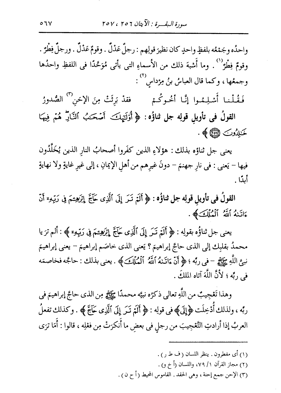 §الْقَوْلُ فِي تَأْوِيلِ قَوْلِهِ تَعَالَى: {أَلَمْ تَرَ إِلَى الَّذِي حَاجَّ إِبْرَاهِيمَ فِي رَبِّهِ أَنْ آتَاهُ اللَّهُ الْمُلْكَ إِذْ قَالَ إِبْرَاهِيمُ رَبِّيَ الَّذِي يُحْيِي وَيُمِيتُ قَالَ أَنَا أُحْيِي وَأُمِيتُ قَالَ إِبْرَاهِيمُ فَإنَّ اللَّهَ يَأْتِي بِالشَّمْسِ مِنَ الْمَشْرِقِ فَأْتِ بِهَا مِنَ الْمَغْرِبَ فَبُهِتَ الَّذِي كَفَرَ وَاللَّهُ لَا يَهْدِي الْقَوْمَ الظَّالِمِينَ} [البقرة: 258] يَعْنِي تَعَالَى ذِكْرُهُ بِقَوْلِهِ: {أَلَمْ تَرَ إِلَى الَّذِي حَاجَّ إِبْرَاهِيمَ فِي رَبِّهِ} [البقرة: 258] أَلَمْ تَرَ يَا مُحَمَّدُ بِقَلْبِكَ الَّذِي حَاجَّ إِبْرَاهِيمَ؟ يَعْنِي الَّذِي خَاصَمَ إِبْرَاهِيمَ، يَعْنِي إِبْرَاهِيمَ نَبِيَّ اللَّهِ صَلَّى اللهُ عَلَيْهِ وَسَلَّمَ فِي رَبِّهِ، {أَنْ آتَاهُ اللَّهُ الْمُلْكَ} [البقرة: 258] يَعْنِي بِذَلِكَ: حَاجَّهُ فَخَاصَمَهُ فِي رَبِّهِ، لِأَنَّ اللَّهَ آتَاهُ الْمُلْكَ، وَهَذَا تَعْجِيبٌ مِنَ اللَّهِ تَعَالَى ذِكْرُهُ نَبِيَّهُ مُحَمَّدًا صَلَّى اللهُ عَلَيْهِ وَسَلَّمَ، مِنَ الَّذِي حَاجَّ إِبْرَاهِيمَ فِي رَبِّهِ، وَلِذَلِكَ أُدْخِلَتْ «إِلَى» فِي قَوْلِهِ: {أَلَمْ تَرَ إِلَى الَّذِي حَاجَّ} [البقرة: 258] وَكَذَلِكَ تَفْعَلُ الْعَرَبُ إِذَا أَرَادَتِ التَّعْجِيبَ مِنْ رَجُلٍ فِي بَعْضِ مَا أَنْكَرَتْ مِنْ فِعْلِهِ، قَالُوا: مَا تَرَى