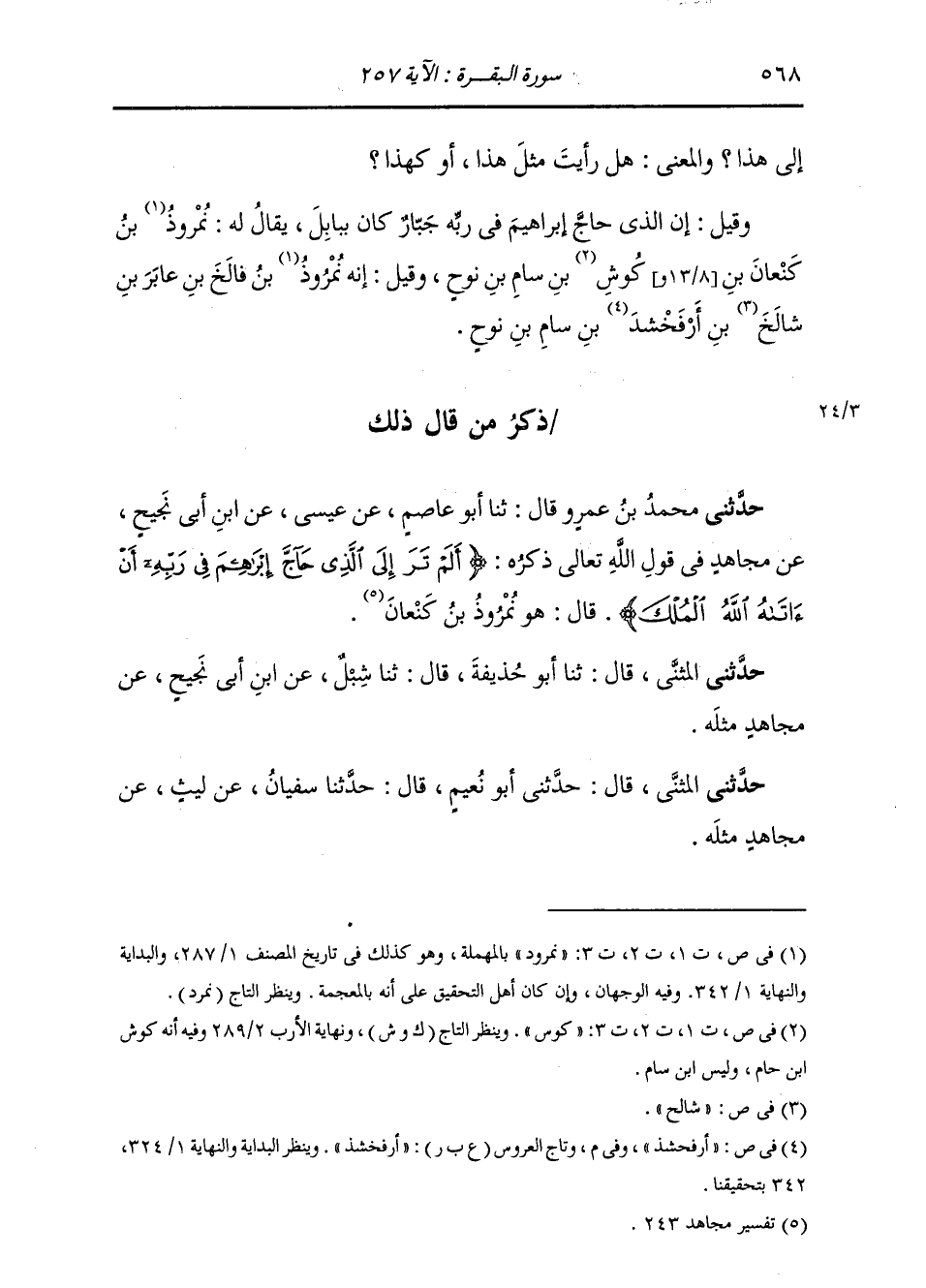 ذِكْرُ مَنْ قَالَ ذَلِكَ: حَدَّثَنِي مُحَمَّدُ بْنُ عَمْرٍو، ثنا أَبُو عَاصِمٍ، عَنْ عِيسَى، عَنِ ابْنِ أَبِي نَجِيحٍ، عَنْ مُجَاهِدٍ، فِي قَوْلِ اللَّهِ: {§أَلَمْ تَرَ إِلَى الَّذِي حَاجَّ} [البقرة: 258] إِبْرَاهِيمَ فِي رَبِّهِ أَنْ آتَاهُ اللَّهُ الْمُلْكَ قَالَ: «هُو نُمْرُودُ بْنُ كَنْعَانَ» حَدَّثَنِي الْمُثَنَّى، قَالَ: ثنا أَبُو حُذَيْفَةَ، قَالَ: ثنا شِبْلٌ، عَنِ ابْنِ أَبِي نَجِيحٍ، عَنْ مُجَاهِدٍ، مِثْلَهُ حَدَّثَنِي الْمُثَنَّى، قَالَ: ثنا أَبُو نُعَيْمٍ، عَنْ سُفْيَانَ، عَنْ لَيْثٍ، عَنْ مُجَاهِدٍ، مِثْلَهُ -[569]- حَدَّثَنَا ابْنُ وَكِيعٍ، قَالَ: ثنا أَبِي، عَنِ النَّضْرِ بْنِ عَدِيٍّ، عَنْ مُجَاهِدٍ، مِثْلَهُ