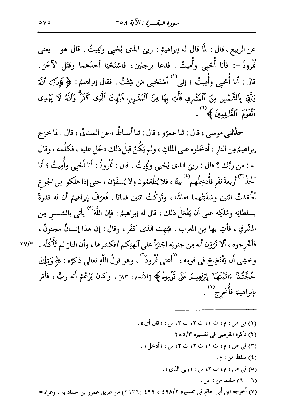 حَدَّثَنِي مُوسَى، قَالَ: ثنا عَمْرٌو، قَالَ: ثنا أَسْبَاطٌ، عَنِ السُّدِّيِّ، قَالَ: " لَمَّا خَرَجَ إِبْرَاهِيمُ مِنَ النَّارِ، أَدْخَلُوهُ عَلَى الْمَلِكِ، وَلَمْ يَكُنْ قَبْلَ ذَلِكَ دَخَلَ عَلَيْهِ فَكَلَّمَهُ، وَقَالَ لَهُ: مَنْ رَبُّكَ؟ ؟ قَالَ: رَبِّي الَّذِي يُحْيِي وَيُمِيتُ، §قَالَ نُمْرُوذُ: أَنَا أُحْيِي وَأُمِيتُ، أَنَا أُدْخِلُ أَرْبَعَةَ نَفَرٍ بَيْتًا، فَلَا يُطْعَمُونَ وَلَا يُسْقَوْنَ، حَتَّى إِذَا هَلَكُوا مِنَ الْجُوعِ أَطْعَمْتُ اثْنَيْنِ وَسَقَيْتُهُمَا فَعَاشَا، وَتَرَكْتُ اثْنَيْنِ فَمَاتَا، فَعَرَفَ إِبْرَاهِيمُ أَنَّ لَهُ قُدْرَةً بِسُلْطَانِهِ وَمُلْكِهِ عَلَى أَنْ يَفْعَلَ ذَلِكَ، قَالَ لَهُ إِبْرَاهِيمُ: فَإِنَّ رَبِّي الَّذِي يَأْتِي بِالشَّمْسِ مِنَ الْمَشْرِقِ، فَأْتِ بِهَا مِنَ الْمَغْرِبِ، فَبُهِتَ الَّذِي كَفَرَ، وَقَالَ: إِنَّ هَذَا إِنْسَانٌ مَجْنُونٌ، فَأَخْرِجُوهُ، أَلَا تَرَوْنَ أَنَّهُ مِنْ جُنُونِهِ اجْتَرَأَ عَلَى آلِهَتِكُمْ فَكَسَّرَهَا، وَأَنَّ النَّارَ لَمْ تَأْكُلْهُ؟ وَخَشِيَ أَنْ يَفْتَضِحَ فِي قَوْمِهِ أَعِنِّي نُمْرُوذَ وَهُوَ قَوْلُ اللَّهِ تَعَالَى ذِكْرُهُ: {وَتِلْكَ حُجَّتُنَا آتَيْنَاهَا إِبْرَاهِيمَ عَلَى قَوْمِهِ} [الأنعام: 83] فَكَانَ يَزْعُمُ أَنَّهُ رَبٌّ، وَأَمَرَ بِإِبْرَاهِيمَ فَأُخْرِجَ "