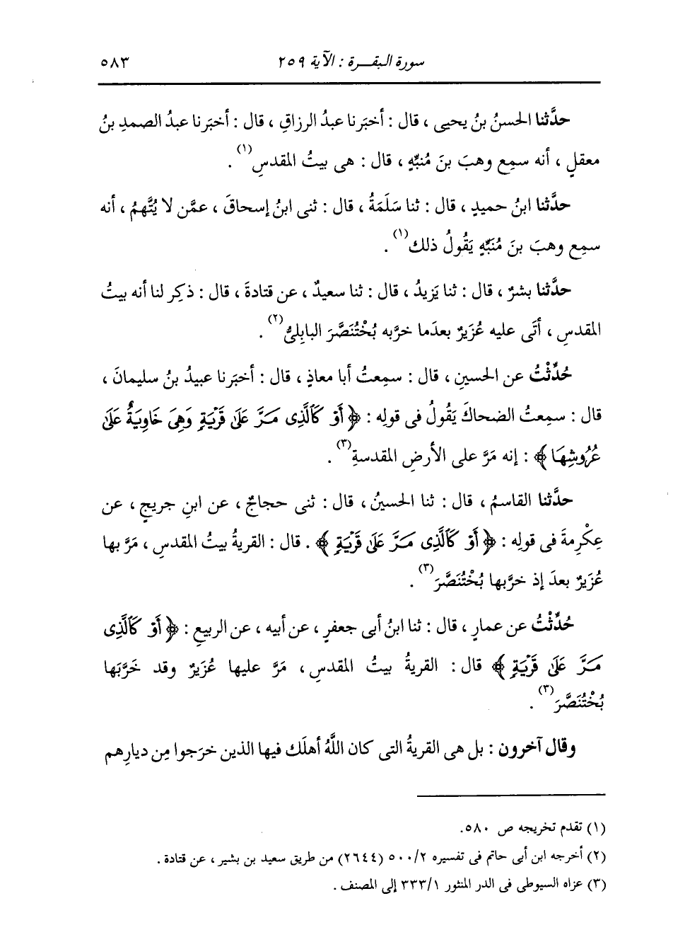 حَدَّثَنَا الْقَاسِمُ، قَالَ: ثنا الْحُسَيْنُ، قَالَ: ثني حَجَّاجٌ، عَنِ ابْنِ جُرَيْجٍ، عَنْ عِكْرِمَةَ، فِي قَوْلِهِ: {§أَوْ كَالَّذِي مَرَّ عَلَى قَرْيَةٍ} [البقرة: 259] قَالَ: «الْقَرْيَةُ بَيْتُ الْمَقْدِسِ، مَرَّ بِهَا عُزَيْرٌ بَعْدَ إِذْ خَرَّبَهَا بُخْتَنَصَّرَ»