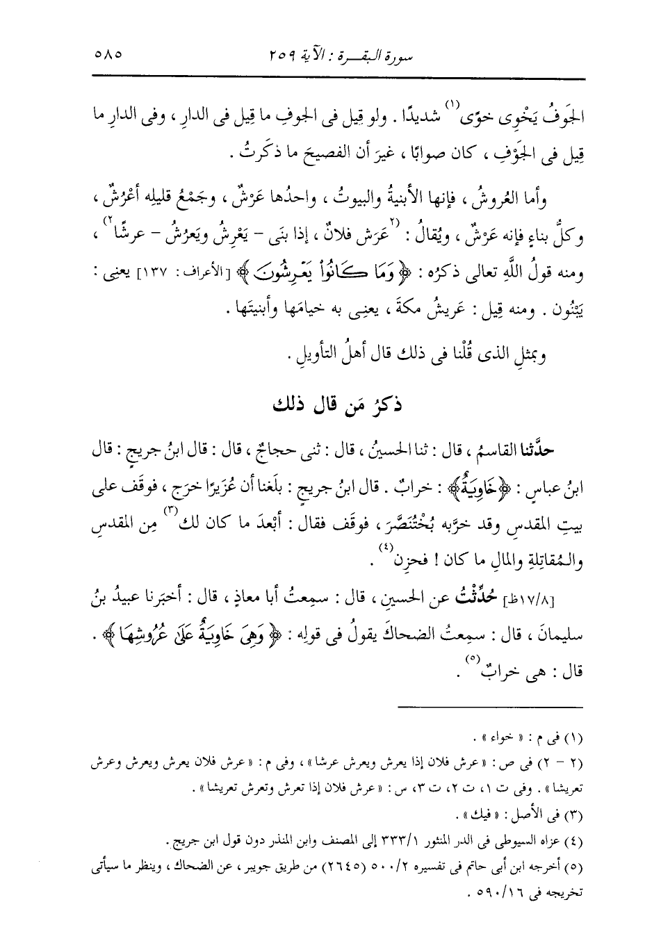 الْجَوْفُ يَخْوَى خَوَاءً شَدِيدًا، وَلَوْ قِيلَ فِي الْجَوْفِ مَا قِيلَ فِي الدَّارِ وَفِي الدَّارِ مَا قِيلَ فِي الْجَوْفِ كَانَ صَوَابًا، غَيْرَ أَنَّ الْفَصِيحَ مَا ذَكَرْتُ، وَأَمَّا الْعُرُوشُ: فَإِنَّهَا الْأَبْنِيَةُ وَالْبُيُوتُ، وَاحِدُهَا عَرْشٌ، وَجَمْعُ قَلِيلِهِ أَعْرُشٌ، وَكُلُّ بِنَاءٍ فَإِنَّهُ عَرْشٌ، وَيُقَالُ: عَرَشَ فُلَانٌ دَارًا يَعْرُشُ وَيعْرِشُ، وَعَرَّشَ تَعْرِيشًا وَمِنْهُ قَوْلُ اللَّهِ تَعَالَى ذِكْرُهُ: {وَمَا كَانُوا يَعْرِشُونَ} [الأعراف: 137] يَعْنِي يَبْنُونَ، وَمِنْهُ قِيلَ عَرِيشُ مَكَّةَ، يَعْنِي بِهِ: خِيَامَهَا وَأَبْنِيَتَهَا، وَبِمِثْلِ الَّذِي قُلْنَا فِي ذَلِكَ قَالَ أَهْلُ التَّأْوِيلِ