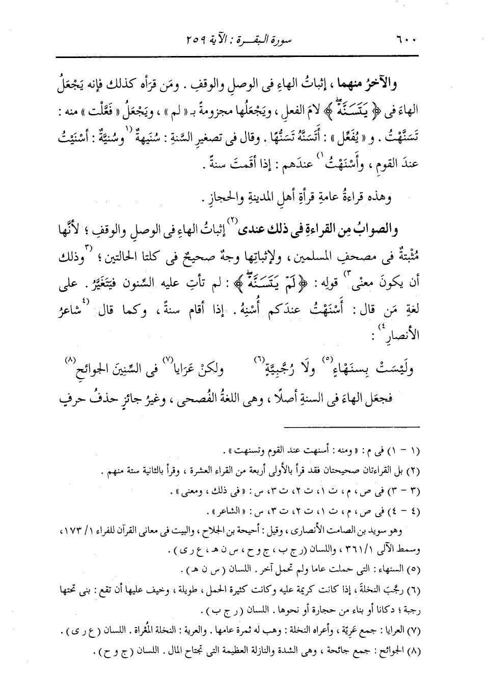 وَالْآخَرُ مِنْهُمَا: إِثْبَاتُ الْهَاءِ فِي الْوَصْلِ وَالْوَقْفِ، وَمَنْ قَرَأَهُ كَذَلِكَ فَإِنَّهُ يَجْعَلُ الْهَاءَ فِي {يَتَسَنَّهْ} [البقرة: 259] لَامَ الْفِعْلِ وَيَجْعَلُهَا مَجْزُومَةً بِلَمْ، وَيَجْعَلُ فَعَلْتُ مِنْهُ تَسَنَّهْتُ، وَيَفْعَلُ: أَتَسَنَّهُ تَسَنُّهًا، وَقَالَ فِي تَصْغِيرِ السَّنَةِ: سُنَيْهِةٌ، وَمِنْهُ: أَسْنَهْتُ عِنْدَ الْقَوْمِ، وَتَسَنَّهْتُ عِنْدَهُمْ: إِذَا أَقَمْتُ سَنَةً، هَذِهِ قِرَاءَةُ عَامَّةِ قُرَّاءِ أَهْلِ الْمَدِينَةِ وَالْحِجَازِ وَالصَّوَابُ مِنَ الْقِرَاءَةِ عِنْدِي فِي ذَلِكَ، إِثْبَاتُ الْهَاءِ فِي الْوَصْلِ وَالْوُقْفِ؛ لِأَنَّهَا مُثْبَتَةٌ فِي مُصْحَفِ الْمُسْلِمِينَ، وَلِإِثْبَاتِهَا وَجْهٌ صَحِيحٌ فِي كِلْتَا الْحَالَتَيْنِ فِي ذَلِكَ. وَمَعْنَى قَوْلِهِ: {لَمْ يَتَسَنَّهْ} [البقرة: 259] لَمْ يَأْتِ عَلَيْهِ السُّنُونَ فَيَتَغَيَّرُ عَلَى لُغَةِ مَنْ قَالَ: أَسْنَهْتُ عِنْدَكُمْ أَسْنَهُ: إِذَا أَقَامَ سَنَةً، وَكَمَا قَالَ الشَّاعِرُ: