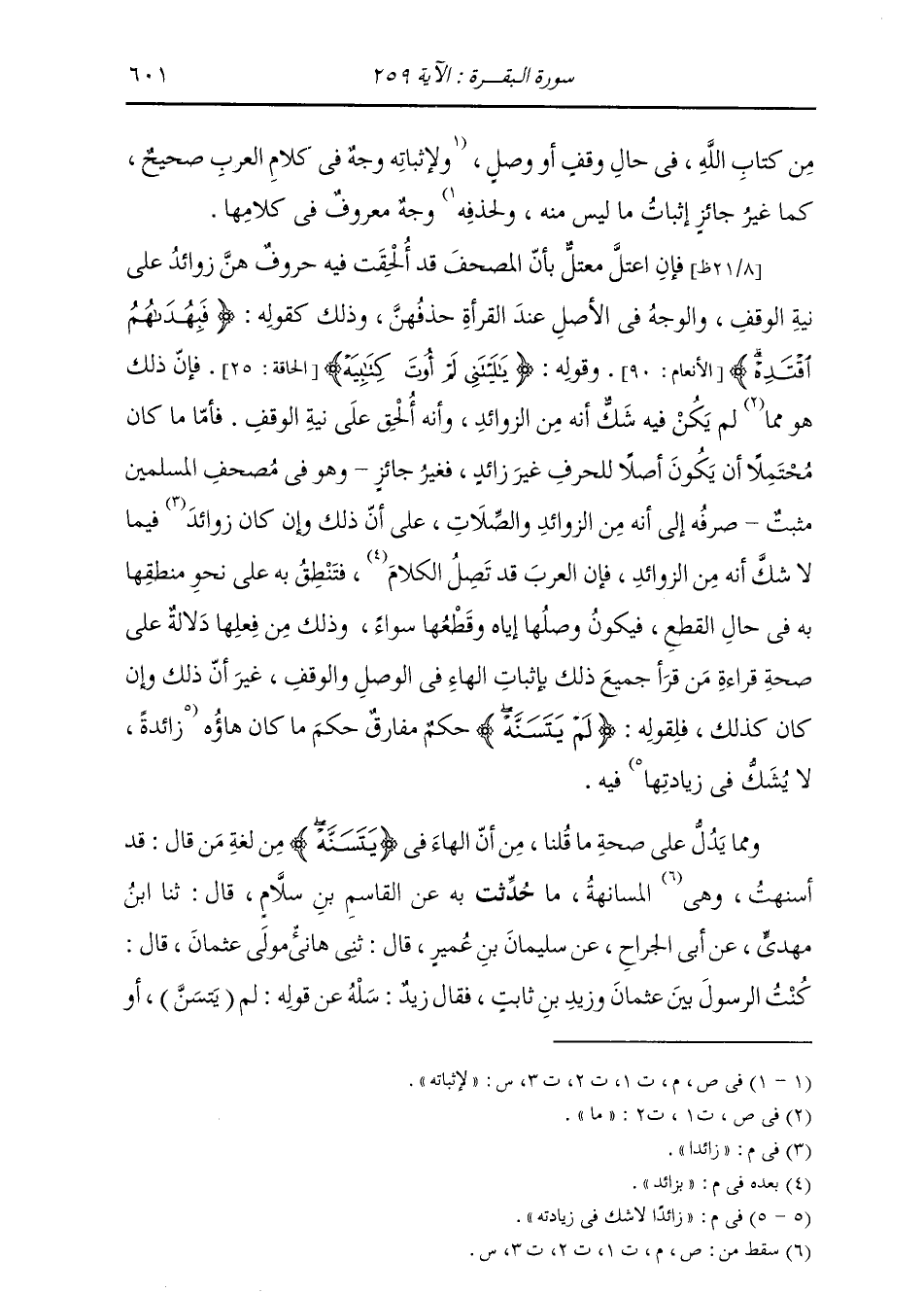 مِنْ كِتَابِ اللَّهِ فِي حَالِ وَقْفٍ أَوْ وَصْلٍ لِإِثْبَاتِهِ وَجْهٌ مَعْرُوفٌ فِي كَلَامِهَا، فَإِنِ اعْتَلَّ مُعْتَلٌّ بِأَنَّ الْمُصْحَفَ قَدْ أُلْحِقَتْ فِيهِ حُرُوفٌ هُنَّ زَوَائدُ عَلَى نِيَّةِ الْوَقْفِ، وَالْوَجْهُ فِي الْأَصْلِ عِنْدَ الْقِرَاءَةِ حَذْفُهُنَّ، وَذَلِكَ كَقَوْلِهِ: {فَبِهُدَاهُمُ اقْتَدِهْ} [الأنعام: 90] وَقَوْلِهِ: {يَا لَيْتَنِي لَمْ أُوتَ كِتَابِيَهْ} [الحاقة: 25] فَإِنَّ ذَلِكَ هُوَ مِمَّا لَمْ يَكُنْ فِيهِ شَكٌّ أَنَّهُ مِنَ الزَّوَائِدِ، وَأَنَّهُ أُلْحِقَ عَلَى نِيَّةِ الْوَقْفِ، فَأَمَّا مَا كَانَ مُحْتَمِلًا أَنْ يَكُونَ أَصْلًا لِلْحَرْفِ غَيْرَ زَائِدٍ فَغَيْرُ جَائِزٍ، وَهُوَ فِي مُصْحَفِ الْمُسْلِمِينَ مُثْبُتٌ، صَرَفَهُ إِلَى أَنَّهُ مِنَ الزَّوَائِدِ وَالصِّلَاتِ عَلَى أَنَّ ذَلِكَ وَإِنْ كَانَ زَائِدًا فِيمَا لَا شَكَّ أَنَّهُ مِنَ الزَّوَائِدِ، فَإِنَّ الْعَرَبَ قَدْ تَصِلُ الْكَلَامَ بِزَائِدٍ، فَتَنْطِقُ بِهِ عَلَى نَحْوِ مَنْطِقِهَا بِهِ فِي حَالِ الْقَطْعِ، فَيَكُونُ وَصْلُهَا إِيَّاهُ وَقَطْعُهَا سَوَاءً، وَذَلِكَ مِنْ فِعْلِهَا دَلَالَةٌ عَلَى صِحَّةِ قِرَاءَةِ مَنْ قَرَأَ جَمِيعَ ذَلِكَ بِإِثْبَاتِ الْهَاءِ فِي الْوَصْلِ وَالْوَقْفِ، غَيْرَ أَنَّ ذَلِكَ وَإِنْ كَانَ كَذَلِكَ فَلِقَوْلِهِ: {لَمْ يَتَسَنَّهْ} [البقرة: 259] حُكْمٌ مَفَارِقٌ حُكْمَ مَا كَانَ هَاؤُهُ زَائِدًا لَا شَكَّ فِي زِيَادَتِهِ فِيهِ وَمِمَّا يَدُلُّ عَلَى صِحَّةِ مَا قُلْنَا، مِنْ أَنَّ الْهَاءَ فِي {يَتَسَنَّهْ} [البقرة: 259] مِنْ لُغَةِ مَنْ قَالَ: قَدْ أَسْنَهْتُ، وَالْمُسَانَهَةُ
