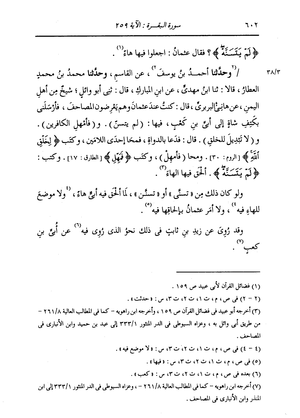 حُدِّثْتُ عَنِ الْقَاسِمِ، وَحَدَّثنا مُحَمَّدُ بْنُ مُحَمَّدٍ الْعَطَّارُ، عَنِ الْقَاسِمِ، وَحَدَّثنا أَحْمَدُ، وَالْعَطَّارُ، جَمِيعًا، عَنِ الْقَاسِمِ، قَالَ: ثنا ابْنُ مَهْدِيٍّ، عَنِ ابْنِ الْمُبَارَكِ، قَالَ: ثني أَبُو وَائِلٍ شَيْخٌ مِنْ أَهْلِ الْيَمَنِ، عَنْ هَانِئٍ الْبَرْبَرِيِّ، قَالَ: " كُنْتُ عِنْدَ عُثْمَانَ وَهُمْ يَعْرِضُونَ الْمَصَاحِفَ، فَأَرْسَلَنِي بِكَتِفِ شَاةٍ إِلَى أُبَيِّ بْنِ كَعْبٍ فِيهَا: §لَمْ يَتَسَنْ وَفَأَمْهِلِ الْكَافِرِينَ , وَلَا تَبْدِيلَ لِلْخَلْقِ، قَالَ: فَدَعَا بِالدَّوَاةِ، فَمَحَا إِحْدَى اللَّامَيْنِ وَكَتَبَ: {لَا تَبْدِيلَ لِخَلْقِ اللَّهِ} [الروم: 30] وَمَحَا فَأَمْهِلْ وَكَتَبَ: {فَمَهِّلِ الْكَافِرِينَ} [الطارق: 17] وَكَتَبَ: {لَمْ يَتَسَنَّهْ} [البقرة: 259] أَلْحَقَ فِيهَا الْهَاءَ «وَلَوْ كَانَ ذَلِكَ مِنْ» يَتَسَنَّى «أَوْ» يَتَسَنَّنُ " لَمَا أَلْحَقَ فِيهِ أُبَيُّ هَاءً لَا مَوْضِعَ لَهَا فِيهِ، وَلَا أَمَرَ عُثْمَانُ بِإِلْحَاقِهَا فِيهَا وَقَدْ رُوِيَ عَنْ زَيْدِ بْنِ ثَابِتٍ فِي ذَلِكَ نَحْوُ الَّذِي رُوِيَ فِيهِ عَنْ أُبَيِّ بْنِ كَعْبٍ -[603]- وَاخْتَلَفَ أَهْلُ التَّأْوِيلَ فِي تَأْوِيلِ قَوْلِهِ {لَمْ يَتَسَنَّهْ} [البقرة: 259] فَقَالَ بَعْضُهُمْ بِمِثْلِ الَّذِي قُلْنَا فِيهِ مِنْ أَنَّ مَعْنَاهُ لَمْ يَتَغَيَّرْ