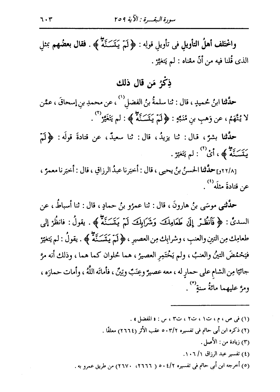 حَدَّثَنَا بِشْرٌ، قَالَ: ثنا يَزِيدُ، قَالَ: ثنا سَعِيدٌ، عَنْ قَتَادَةَ، قَوْلُهُ: {§لَمْ يَتَسَنَّهْ} [البقرة: 259] «لَمْ يَتَغَيَّرْ» حَدَّثَنَا الْحَسَنُ بْنُ يَحْيَى، قَالَ: أَخْبَرَنَا عَبْدُ الرَّزَّاقِ، قَالَ: أَخْبَرَنَا مَعْمَرٌ، عَنْ قَتَادَةَ، مِثْلَهُ