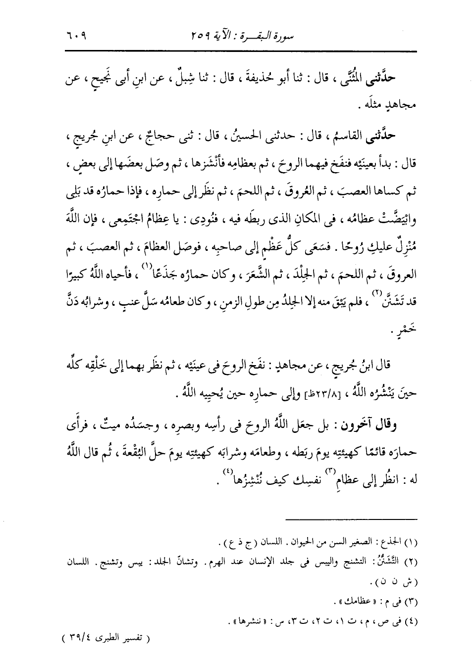 حَدَّثَنَا الْقَاسِمُ، قَالَ: حَدَّثَنَا الْحُسَيْنُ، قَالَ: ثني حَجَّاجٌ، عَنِ ابْنِ جُرَيْجٍ، قَالَ: " §بَدَأَ بِعَيْنَيْهِ فَنَفَخَ فِيهِمَا الرُّوحَ، ثُمَّ بِعِظَامِهِ فَأَنْشَزَهَا، ثُمَّ وَصَّلَ بَعْضَهَا إِلَى بَعْضٍ، ثُمَّ كَسَاهَا الْعَصْبَ، ثُمَّ الْعُرُوقَ، ثُمَّ اللَّحْمَ. ثُمَّ نَظَرَ إِلَى حِمَارِهِ، فَإِذَا حِمَارُهُ قَدْ بَلِيَ وَابْيَضَّتْ عِظَامُهُ فِي الْمَكَانِ الَّذِي رَبَطَهُ فِيهِ، فَنُودِيَ: يَا عِظَامُ اجْتَمِعِي، فَإِنَّ اللَّهَ مَنْزِلٌ عَلَيْكِ رُوحًا، فَسَعَى كُلُّ عَظْمٍ إِلَى صَاحِبِهِ، فَوَصَّلَ الْعِظَامَ، ثُمَّ الْعَصْبَ، ثُمَّ الْعُرُوقَ، ثُمَّ اللَّحْمَ، ثُمَّ الْجِلْدَ، ثُمَّ الشَّعْرَ، وَكَانَ حِمَارُهُ جَذَعًا، فَأَحْيَاهُ اللَّهُ كَبِيرًا قَدْ تَشَنَّنَ، فَلَمْ يَبْقَ مِنْهُ إِلَّا الْجِلْدُ مِنْ طُولِ الزَّمَنِ، وَكَانَ طَعَامُهُ سَلَّ عِنَبٍ وَشَرَابُهُ دَنَّ خَمْرٍ " قَالَ ابْنُ جُرَيْجٍ عَنْ مُجَاهِدٍ: " نَفَخَ الرُّوحَ فِي عَيْنَيْهِ، ثُمَّ نَظَرَ بِهِمَا إِلَى خَلْقِهِ كُلِّهِ حِينَ نَشَرَهُ اللَّهُ، وَإِلَى حِمَارِهِ حِينَ يُحْيِيهِ اللَّهُ وَقَالَ آخَرُونَ: بَلْ جَعَلَ اللَّهُ الرُّوحَ فِي رَأْسِهِ وَبَصَرِهِ وَجَسَدُهُ مَيِّتًا، فَرَأَى حِمَارَهُ قَائِمًا كَهَيْئَتِهِ يَوْمَ رَبَطَهُ وَطَعَامَهُ وَشَرَابَهُ كَهَيْئَتِهِ يَوْمَ حَلَّ الْبُقْعَةَ، ثُمَّ قَالَ اللَّهُ لَهُ: انْظُرْ إِلَى عِظَامِ نَفْسِكَ كَيْفَ نُنْشِزُهَا