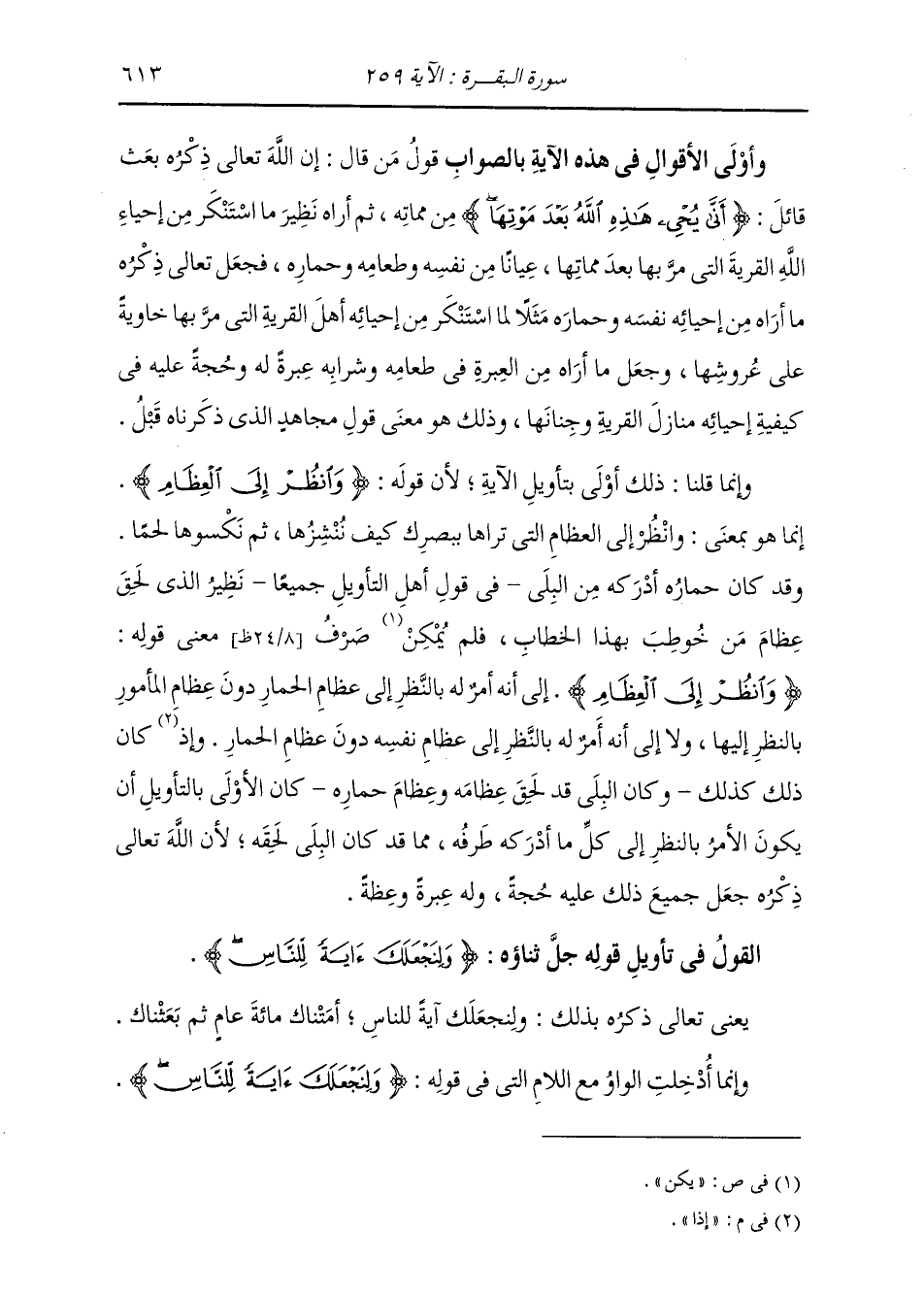 §الْقَوْلُ فِي تَأْوِيلِ قَوْلِهِ تَعَالَى: {وَلِنَجْعَلَكَ آيَةً لِلنَّاسِ} [البقرة: 259] يَعْنِي تَعَالَى ذِكْرُهُ بِذَلِكَ: {وَلِنَجْعَلَكَ آيَةً لِلنَّاسِ} [البقرة: 259] أَمَتْنَاكَ مِائَةَ عَامٍ ثُمَّ بَعَثْنَاكَ، وَإِنَّمَا أُدْخِلَتِ الْوَاوُ مَعَ اللَّامِ الَّتِي فِي قَوْلِهِ: {وَلِنَجْعَلَكَ آيَةً لِلنَّاسِ} [البقرة: 259]