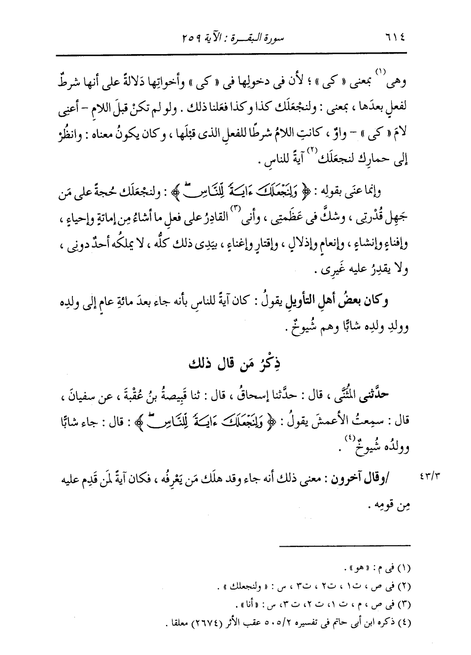 ذِكْرُ مَنْ قَالَ ذَلِكَ: حَدَّثَنِي الْمُثَنَّى، قَالَ: أَخْبَرَنَا إِسْحَاقُ، قَالَ: ثنا قَبِيصَةُ بْنُ عُقْبَةَ، عَنْ سُفْيَانَ، قَالَ: سَمِعْتُ الْأَعْمَشَ، يَقُولُ: {§وَلِنَجْعَلَكَ آيَةً لِلنَّاسِ} [البقرة: 259] قَالَ: «جَاءَ شَابًّا وَوَلَدُهُ شُيُوخٌ» وَقَالَ آخَرُونَ: مَعْنَى ذَلِكَ أَنَّهُ جَاءَ وَقَدْ هَلَكَ مَنْ يَعْرِفُهُ، فَكَانَ آيَةً لِمَنْ قَدِمَ عَلَيْهِ مِنْ قَوْمِهِ