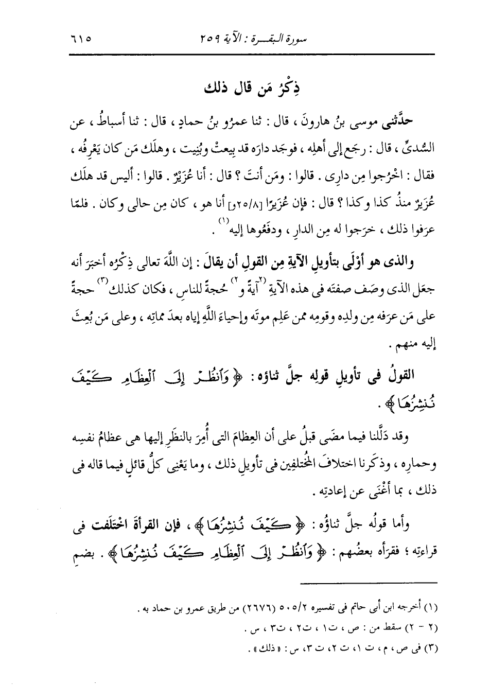 §الْقَوْلُ فِي تَأْوِيلِ قَوْلِهِ تَعَالَى: {وَانْظُرْ إِلَى الْعِظَامِ كَيْفَ نُنْشِزُهَا} [البقرة: 259] قَدْ دَلَّلْنَا فِيمَا مَضَى قَبْلُ عَلَى أَنَّ الْعِظَامَ الَّتِي أُمِرَ بِالنَّظَرِ إِلَيْهَا هِيَ عِظَامُ نَفْسِهِ وَحِمَارِهِ، وَذَكَرْنَا اخْتِلَافَ الْمُخْتَلِفِينَ فِي تَأْوِيلِ ذَلِكَ وَمَا يَعْنِي كُلُّ قَائِلٍ بِمَا قَالَهُ فِي ذَلِكَ بِمَا أَغْنَى عَنْ إِعَادَتِهِ وَأَمَّا قَوْلُهُ: {كَيْفَ نُنْشِزُهَا} [البقرة: 259] فَإِنَّ الْقُرَّاءَ اخْتَلَفَتْ فِي قِرَاءَتِهِ، فَقَرَأَ بَعْضُهُمْ: {وَانْظُرْ إِلَى الْعِظَامِ كَيْفَ نُنْشِزُهَا} [البقرة: 259] بِضَمِّ