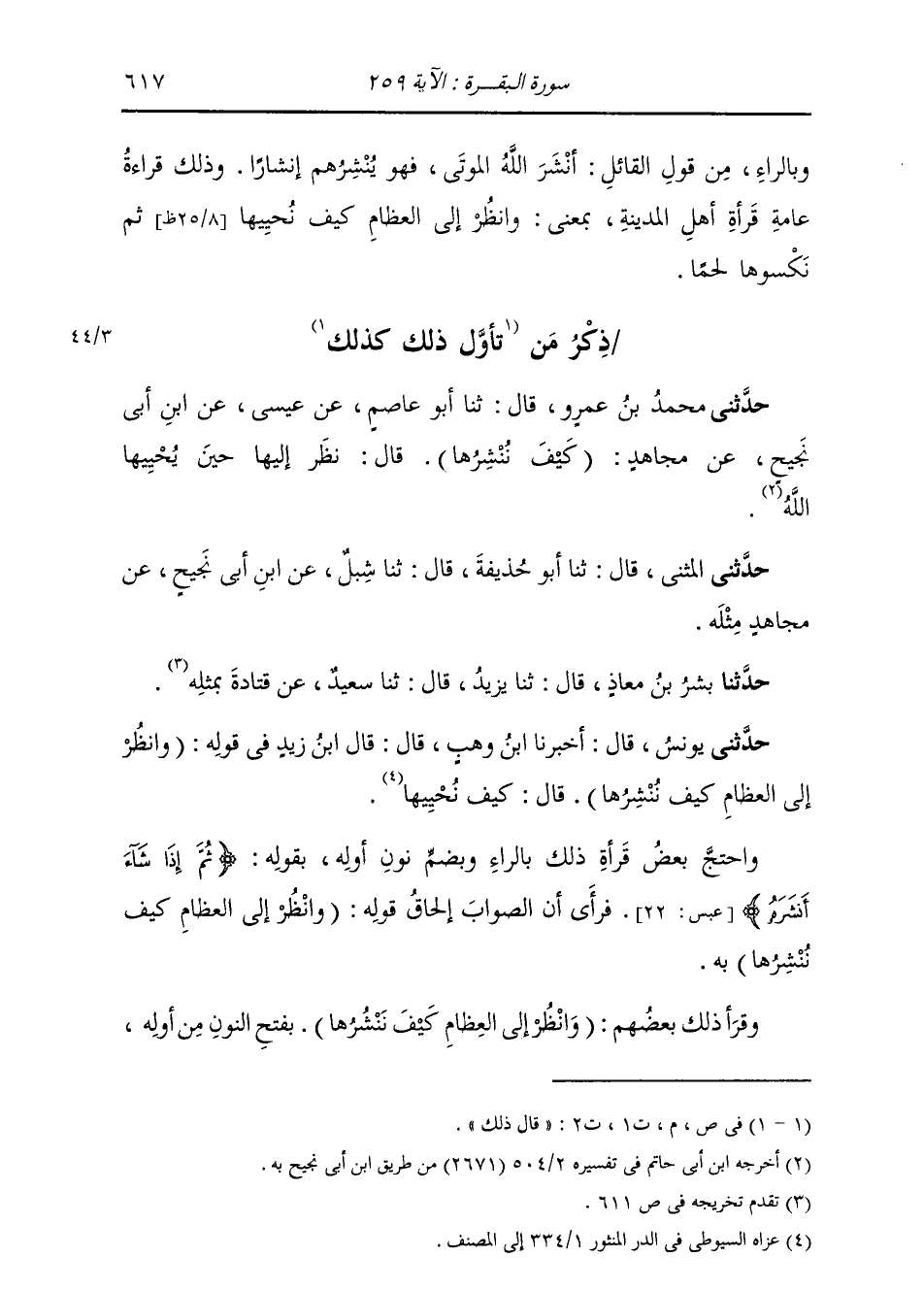 ذِكْرُ مَنْ قَالَ ذَلِكَ: حَدَّثَنِي مُحَمَّدُ بْنُ عَمْرٍو، قَالَ: ثنا أَبُو عَاصِمٍ، قَالَ: ثنا عِيسَى، عَنِ ابْنِ أَبِي نَجِيحٍ، عَنْ مُجَاهِدٍ: (§كَيْفَ نُنْشِرُهَا) قَالَ: «انْظُرْ إِلَيْهَا حِينَ يُحْيِيهَا اللَّهُ» حَدَّثَنِي الْمُثَنَّى قَالَ: ثنا أَبُو حُذَيْفَةَ، قَالَ: ثنا شِبْلٌ، عَنِ ابْنِ أَبِي نَجِيحٍ، عَنْ مُجَاهِدٍ، مِثْلَهُ حَدَّثَنَا بِشْرٌ، قَالَ: ثنا يَزِيدُ، قَالَ: ثنا سَعِيدٌ، عَنْ قَتَادَةَ، مِثْلَهُ