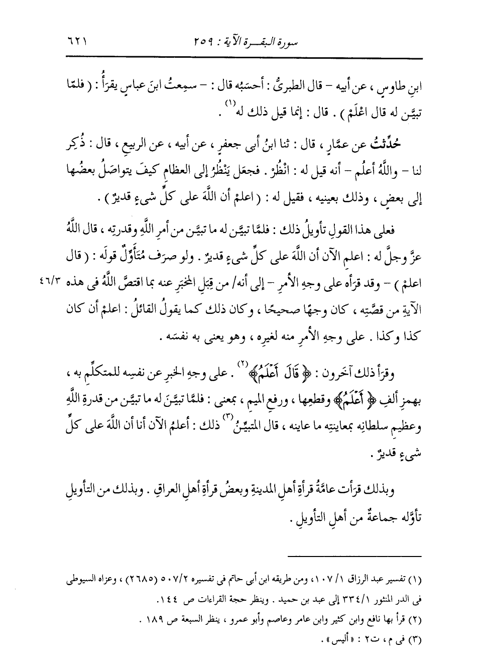 حُدِّثْتُ عَنْ عَمَّارٍ، قَالَ: ثنا ابْنُ أَبِي جَعْفَرٍ، عَنْ أَبِيهِ، عَنِ الرَّبِيعِ، قَالَ: " ذُكِرَ لَنَا وَاللَّهُ أَعْلَمُ أَنَّهُ قِيلَ لَهُ: انْظُرْ، فَجَعَلَ يَنْظُرُ إِلَى §الْعِظَامِ كَيْفَ يَتَوَاصَلُ بَعْضُهَا إِلَى بَعْضٍ، وَذَلِكَ بِعَيْنَيْهِ، فَقِيلَ: اعْلَمْ أَنَّ اللَّهَ عَلَى كُلِّ شَيْءٍ قَدِيرٌ " فَعَلَى هَذَا الْقَوْلِ تَأْوِيلُ ذَلِكَ: فَلَمَّا تَبَيَّنَ مِنْ أَمْرِ اللَّهِ وَقُدْرَتِهِ، قَالَ اللَّهُ لَهُ: اعْلَمْ الْآنَ أَنَّ اللَّهَ عَلَى كُلِّ شَيْءٍ قَدِيرٌ، وَلَوْ صَرَفَ مُتَأَوِّلٌ قَوْلَهُ: قَالَ اعْلَمْ، وَقَدْ قَرَأَهُ عَلَى وَجْهِ الْأَمْرِ إِلَى أَنَّهُ مِنْ قِبَلِ الْمُخْبَرِ عَنْهُ بِمَا اقْتَصَّ فِي هَذِهِ الْآيَةِ مِنْ قِصَّتِهِ كَانَ وَجْهًا صَحِيحًا، وَكَانَ ذَلِكَ كَمَا يَقُولُ الْقَائِلُ: اعْلَمْ أَنْ قَدْ كَانَ كَذَا وَكَذَا، عَلَى وَجْهِ الْأَمْرِ مِنْهُ لِغَيْرِهِ وَهُوَ يَعْنِي بِهِ نَفْسَهِ، وَقَرَأَ ذَلِكَ آخَرُونَ: {قَالَ أَعْلَمُ} [البقرة: 259] عَلَى وَجْهِ الْخَبَرِ عَنْ نَفْسِهِ لِلْمُتَكَلِّمِ بِهِ بِهَمْزِ أَلْفِ {أَعْلَمُ} [البقرة: 259] وَقَطْعِهَا وَرَفْعِ الْمِيمِ، بِمَعْنَى: فَلَمَّا تَبَيَّنَ لَهُ مِنْ قُدْرَةِ اللَّهِ وَعَظِيمِ سُلْطَانِهِ بِمُعَايَنَتِهِ مَا عَايَنَهُ، قَالَ: أَلَيْسَ ذَلِكَ، أَعْلَمُ الْآنَ أَنَا أَنَّ اللَّهَ عَلَى كُلِّ شَيْءٍ قَدِيرٌ؟ وَبِذَلِكَ قَرَأَ عَامَّةُ أَهْلِ الْمَدِينَةِ وَبَعْضُ قُرَّاءِ أَهْلِ الْعِرَاقِ، وَبِذَلِكَ مِنَ التَّأْوِيلِ تَأَوَّلَهُ جَمَاعَةٌ مِنْ أَهْلِ التَّأْوِيلِ