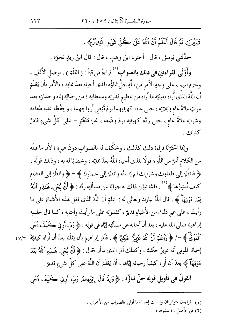 تَبَيَّنَ لَهُ قَالَ أَعْلَمُ أَنَّ اللَّهَ عَلَى كُلِّ شَيْءٍ قَدِيرٌ} [البقرة: 259] حَدَّثَنِي يُونُسُ، قَالَ: أَخْبَرَنَا ابْنُ وَهْبٍ، قَالَ: قَالَ ابْنُ زَيْدٍ، نَحْوَهُ وَأَوْلَى الْقِرَاءَتَيْنِ بِالصَّوَابِ فِي ذَلِكَ قِرَاءَةُ مِنْ قَرَأَ: (اعْلَمْ) بِوَصْلِ الْأَلْفِ وَجَزْمِ الْمِيمِ عَلَى وَجْهِ الْأَمْرِ مِنَ اللَّهِ تَعَالَى ذِكْرُهُ لِلَّذِي قَدْ أَحْيَاهُ بَعْدَ مَمَاتِهِ بِالْأَمْرِ بِأَنْ يَعْلَمَ أَنَّ اللَّهَ الَّذِي أَرَاهُ بِعَيْنَيْهِ مَا أَرَاهُ مِنْ عَظِيمِ قُدْرَتِهِ وَسُلْطَانِهِ مِنْ إِحْيَائِهِ إِيَّاهُ وَحِمَارَهُ بَعْدَ مَوْتِ مِائَةِ عَامٍ وَبَلَائِهِ حَتَّى عَادَا كَهَيْئَتِهِمَا يَوْمَ قَبَضَ أَرْوَاحَهُمَا، وَحَفِظَ عَلَيْهِ طَعَامَهُ وَشَرَابَهُ مِائَةَ عَامٍ حَتَّى رَدَّهُ عَلَيْهِ كَهَيْئَتِهِ يَوْمَ وَضَعَهُ غَيْرَ مُتَغَيِّرٍ عَلَى كُلِّ شَيْءِ قَادِرٌ كَذَلِكَ. وَإِنَّمَا اخْتَرْنَا قِرَاءَةَ ذَلِكَ كَذَلِكَ وَحَكَمْنَا لَهُ بِالصَّوَابِ دُونَ غَيْرِهِ؛ لِأَنَّ مَا قَبْلَهُ مِنَ الْكَلَامِ أَمْرٌ مِنَ اللَّهِ تَعَالَى ذِكْرُهُ قَوْلًا لِلَّذِي أَحْيَاهُ اللَّهُ بَعْدَ مَمَاتِهِ وَخِطَابًا لَهُ بِهِ، وَذَلِكَ قَوْلُهُ: {فَانْظُرْ إِلَى طَعَامِكَ وَشَرَابِكَ لَمْ يَتَسَنَّهْ وَانْظُرْ إِلَى حِمَارِكَ} [البقرة: 259] ، {وَانْظُرْ إِلَى الْعِظَامِ كَيْفَ نُنْشِزُهَا} [البقرة: 259] فَلَمَّا تَبَيَّنَ لَهُ ذَلِكَ جَوَابًا عَنْ مَسْأَلَتِهِ رَبَّهُ: {أَنَّى يُحْيِي هَذِهِ اللَّهُ بَعْدَ مَوْتِهَا} [البقرة: 259] ؟ قَالَ اللَّهُ لَهُ: اعْلَمْ أَنَّ اللَّهَ الَّذِي فَعَلَ هَذِهِ الْأَشْيَاءَ عَلَى مَا رَأَيْتَ عَلَى غَيْرِ ذَلِكَ مِنَ الْأَشْيَاءِ قَدِيرٌ كَقُدْرَتِهِ عَلَى مَا رَأَيْتَ وَأَمْثَالِهِ، كَمَا قَالَ تَعَالَى ذِكْرُهُ لِخَلِيلِهِ إِبْرَاهِيمَ صَلَّى اللهُ عَلَيْهِ وَسَلَّمَ، بَعْدَ أَنْ أَجَابَهُ عَنْ مَسْأَلَتِهِ إِيَّاهُ فِي قَوْلِهِ: {رَبِّ أَرِنِي كَيْفَ تُحْيِي الْمَوْتَى} [البقرة: 260] {وَاعْلَمْ أَنَّ اللَّهَ عَزِيزٌ حَكِيمٌ} [البقرة: 260] فَأَمَرَ إِبْرَاهِيمَ بِأَنْ يَعْلَمَ بَعْدَ أَنْ أَرَاهُ كَيْفِيَّةَ إِحْيَائِهِ الْمَوْتَى أَنَّهُ عَزِيزٌ حَكِيمٌ، فَكَذَلِكَ أَمَرَ الَّذِي سَأَلَ فَقَالَ: {أَنَّى يُحْيِي هَذِهِ اللَّهُ بَعْدَ مَوْتِهَا} [البقرة: 259] بَعْدَ أَنْ أَرَاهُ كَيْفِيَّةَ إِحْيَائِهِ إِيَّاهَا أَنْ يَعْلَمَ أَنَّ اللَّهَ عَلَى كُلِّ شَيْءٍ قَدِيرٌ