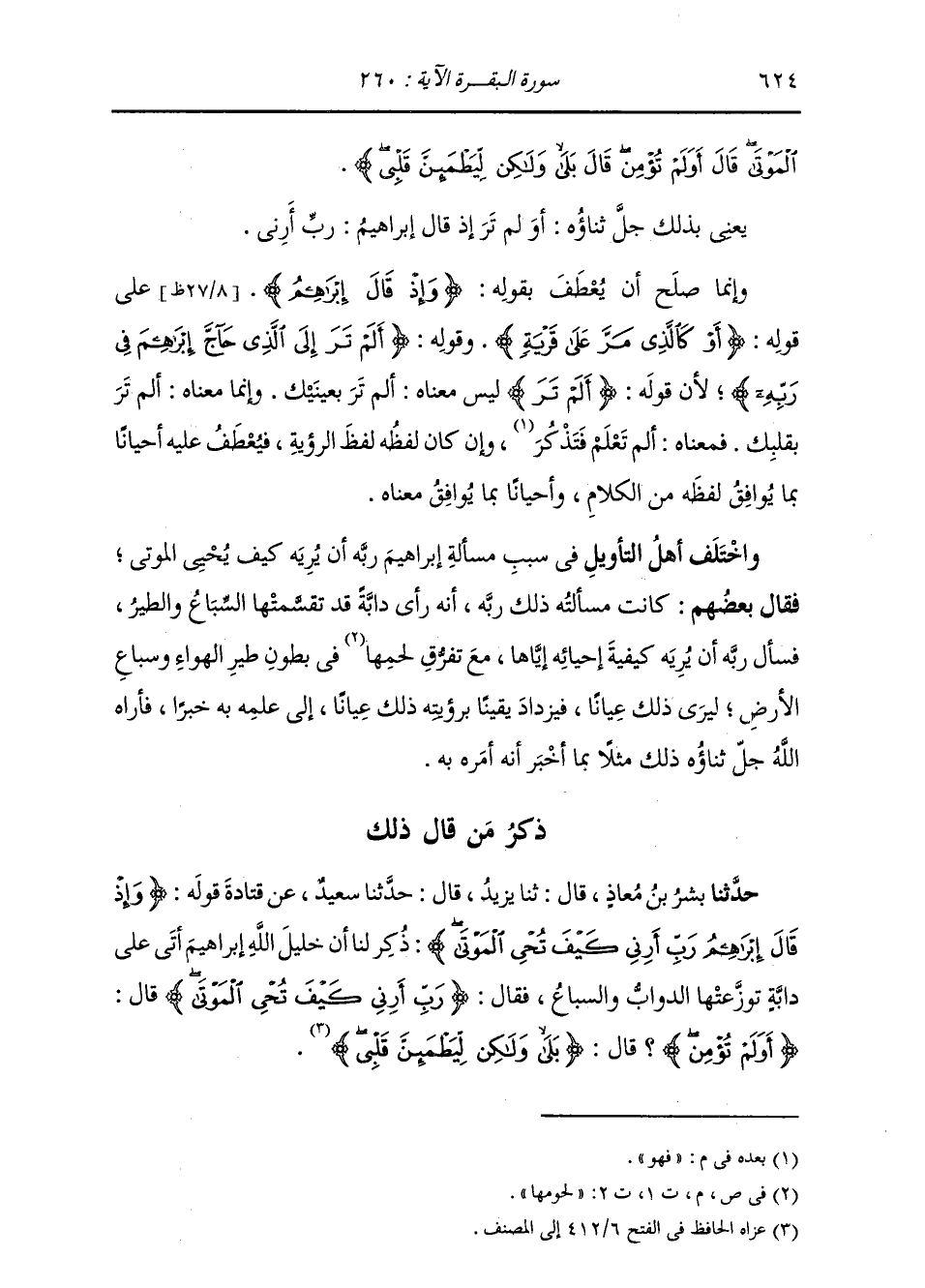 ذِكْرُ مَنْ قَالَ ذَلِكَ: حَدَّثَنَا بِشْرُ بْنُ مُعَاذٍ، قَالَ: ثنا يَزِيدُ بْنُ زُرَيْعٍ، قَالَ: حَدَّثَنَا سَعِيدٌ، عَنْ قَتَادَةَ، قَوْلُهُ: {§وَإِذْ قَالَ إِبْرَاهِيمُ رَبِّ أَرِنِي كَيْفَ تُحْيِي الْمَوْتَى} [البقرة: 260] " ذُكِرَ لَنَا أَنَّ خَلِيلَ اللَّهِ إِبْرَاهِيمَ صَلَّى اللهُ عَلَيْهِ وَسَلَّمَ أَتَى عَلَى دَابَّةٍ تَوَزَّعَتْهَا الدَّوَابُّ وَالسِّبَاعُ، فَقَالَ: {رَبِّ أَرِنِي كَيْفَ تُحْيِي الْمَوْتَى قَالَ أَوَلَمْ تُؤْمِنْ قَالَ بَلَى وَلَكِنْ لِيَطْمَئِنَّ قَلْبِي} [البقرة: 260] "