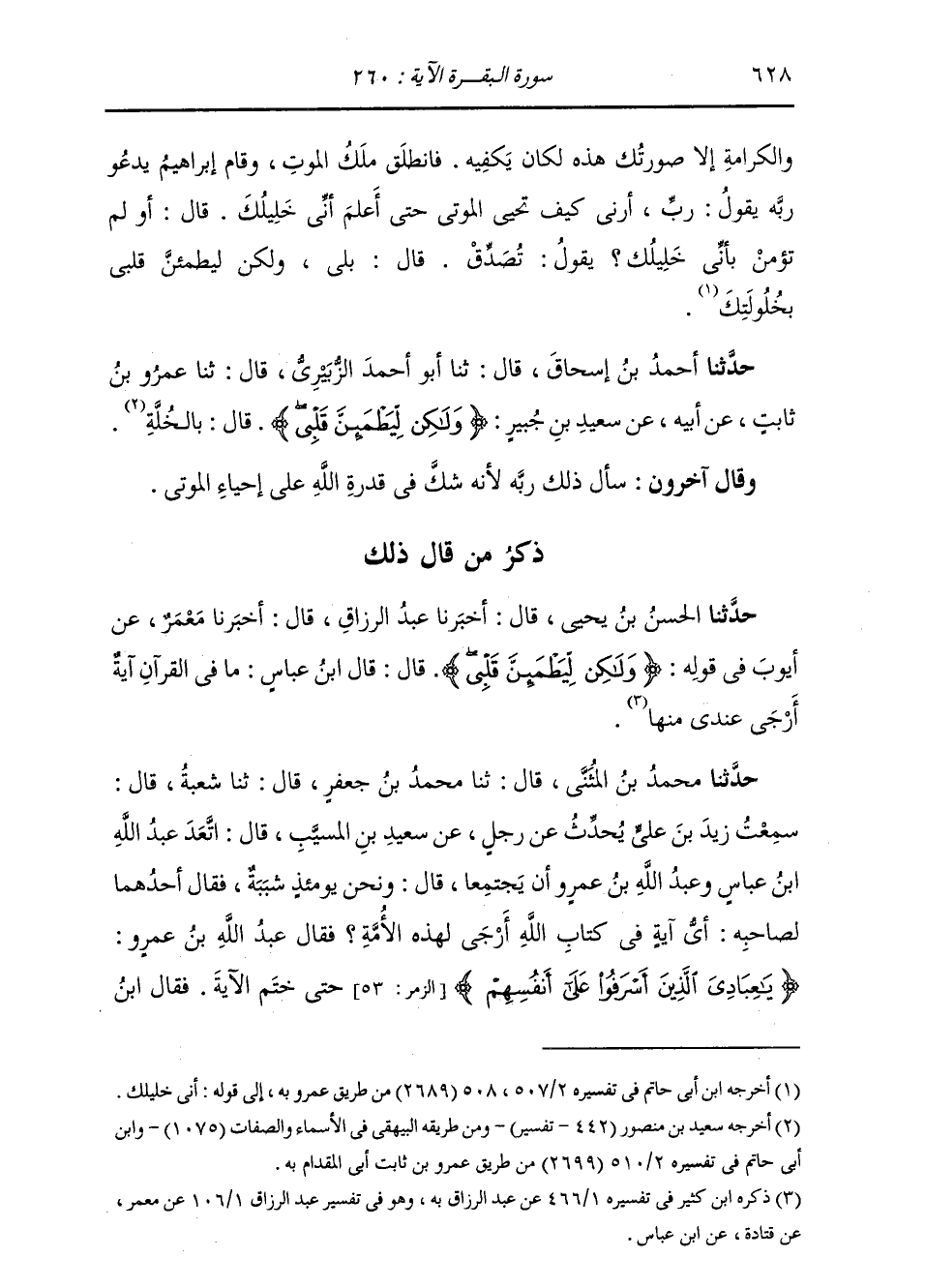 ذِكْرُ مَنْ قَالَ ذَلِكَ: حَدَّثَنَا الْحَسَنُ بْنُ يَحْيَى، قَالَ: أَخْبَرَنَا عَبْدُ الرَّزَّاقِ، قَالَ: أَخْبَرَنَا مَعْمَرٌ، عَنْ أَيُّوبَ، فِي قَوْلِهِ: {§وَلَكِنْ لِيَطْمَئِنَّ قَلْبِي} [البقرة: 260] قَالَ: قَالَ ابْنُ عَبَّاسٍ: «مَا فِي الْقُرْآنِ آيَةٌ أَرْجَى عِنْدِي مِنْهَا»
