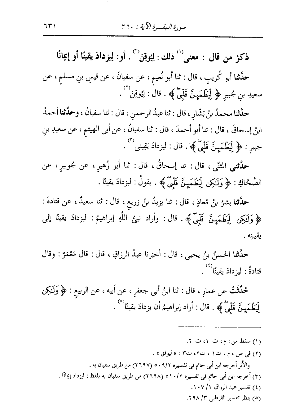 حَدَّثَنَا مُحَمَّدُ بْنُ بَشَّارٍ، قَالَ: ثنا عَبْدُ الرَّحْمَنِ، قَالَ: ثنا سُفْيَانُ، وَحَدَّثنا أَحْمَدُ بْنُ إِسْحَاقَ، قَالَ: ثنا أَبُو أَحْمَدَ، قَالَ: ثنا سُفْيَانُ، عَنْ أَبِي الْهَيْثَمِ، عَنْ سَعِيدِ بْنِ جُبَيْرٍ: {§لِيَطْمَئِنَّ قَلْبِي} [البقرة: 260] قَالَ: «لِيَزْدَادَ يَقِينِي»