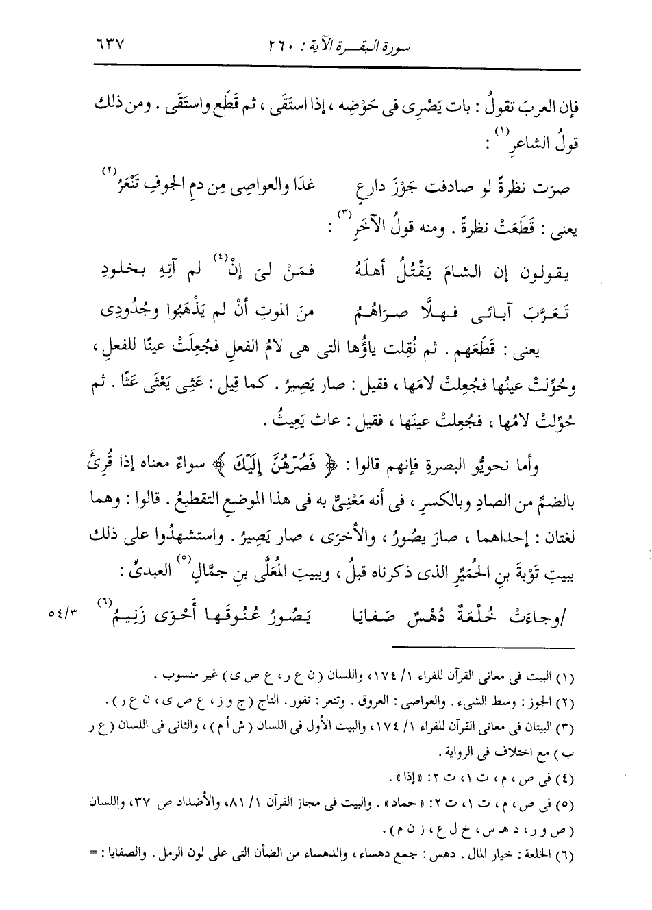 يَعْنِي قَطَعَهُمْ، ثُمَّ نُقِلَتْ يَاؤُهَا الَّتِي هِيَ لَامُ الْفِعْلِ فَجُعِلَتْ عَيْنًا لِلْفِعْلِ، وَحُوِّلَتْ عَيْنُهَا فَجُعِلَتْ لَامَهَا، فَقِيلَ صَارَ يَصِيرُ، كَمَا قِيلَ: عَثِيَ يَعْثَى عَثًا، ثُمَّ حُوِّلَتْ لَامُهَا، فَجُعِلَتْ عَيْنَهَا، فَقِيلَ عَاثَ يَعِيثُ. فَأَمَّا نَحْوِيُّو الْبَصْرَةِ فَإِنَّهُمْ قَالُوا: {فَصُرْهُنَّ إِلَيْكَ} [البقرة: 260] سَوَاءٌ مَعْنَاهُ إِذَا قُرِئَ بِالضَّمِّ مِنَ الصَّادِ وَبِالْكَسْرِ فِي أَنَّهُ مَعْنِيُّ بِهِ فِي هَذَا الْمَوْضِعِ التَّقْطِيعُ، قَالُوا: وَهُمَا لُغَتَانِ: إِحْدَاهُمَا صَارَ يَصُورُ، وَالْأُخْرَى صَارَ يَصِيرُ، وَاسْتَشْهَدُوا عَلَى ذَلِكَ بِبَيْتِ تَوْبَةَ بْنِ الْحُمَيِّرِ الَّذِي ذَكَرْنَا قَبْلُ، وَبِبَيْتِ الْمُعَلَّى بْنِ جَمَّالٍ الْعَبْدِيِّ: