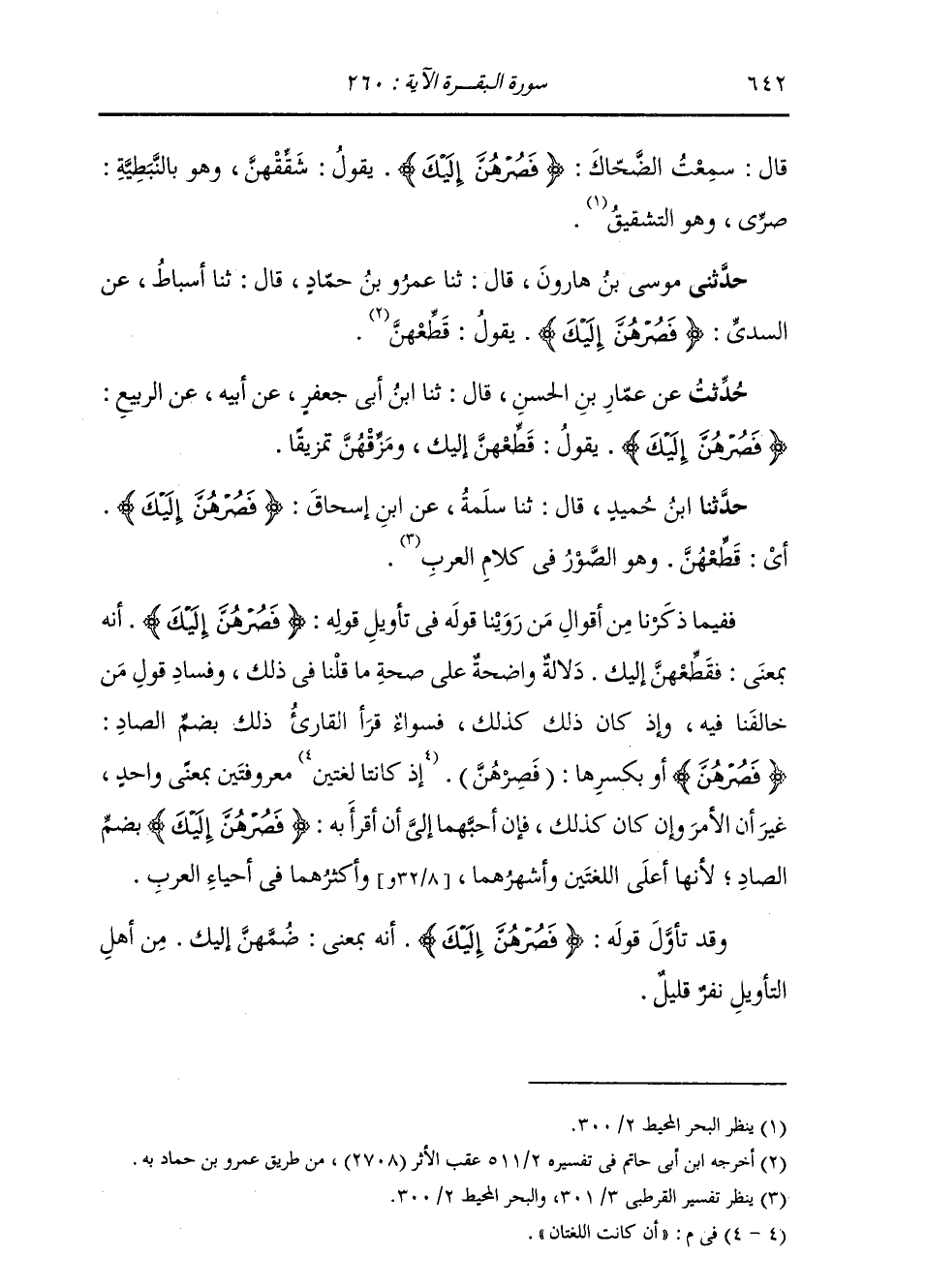 حَدَّثَنَا ابْنُ حُمَيْدٍ، قَالَ: ثنا سَلَمَةُ، عَنِ ابْنِ إِسْحَاقَ: {§فَصُرْهُنَّ إِلَيْكَ} [البقرة: 260] «أَيْ قَطِّعْهُنَّ، وَهُوَ الصَّوْرُ فِي كَلَامِ الْعَرَبِ» فَفِيمَا ذَكَرْنَا مِنْ أَقْوَالِ مَنْ رَوَيْنَا فِي تَأْوِيلِ قَوْلِهِ: {فَصُرْهُنَّ إِلَيْكَ} [البقرة: 260] أَنَّهُ بِمَعْنَى فَقَطِّعْهُنَّ إِلَيْكَ دَلَالَةٌ وَاضِحَةٌ عَلَى صِحَّةِ مَا قُلْنَا فِي ذَلِكَ، وَفَسَادِ قَوْلِ مَنْ خَالَفَنَا فِيهِ، وَإِذْ كَانَ ذَلِكَ كَذَلِكَ، فَسَوَاءٌ قَرَأَ الْقَارِئُ ذَلِكَ بِضَمِّ الصَّادِ {فَصُرْهُنَّ إِلَيْكَ} [البقرة: 260] أَوْ كَسْرِهَا (فَصِرْهُنَّ) إِذْ كَانَتِ اللُّغَتَانِ مَعْرُوفَتَيْنِ بِمَعْنًى وَاحِدٍ، غَيْرَ أَنَّ الْأَمْرَ وَإِنْ كَانَ كَذَلِكَ، فَإِنَّ أَحَبَّهُمَا إِلَيَّ أَنْ أَقْرَأَ بِهِ {فَصُرْهُنَّ إِلَيْكَ} [البقرة: 260] بِضَمِّ الصَّادِ؛ لِأَنَّهَا أَعْلَى اللُّغَتَيْنِ وَأَشْهَرُهُمَا وَأَكْثَرُهُمَا فِي أَحْيَاءِ الْعَرَبِ وَعِنْدَ نَفَرٍ قَلِيلٍ مِنْ أَهْلِ التَّأْوِيلِ أَنَّهَا بِمَعْنَى: أَوْثِقْ