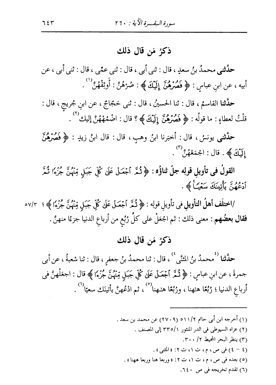 ذِكْرُ مَنْ قَالَ ذَلِكَ: حَدَّثَنِي الْمُثَنَّى، قَالَ: ثنا مُحَمَّدُ بْنُ جَعْفَرٍ، قَالَ: ثنا شُعْبَةُ، عَنْ أَبِي جَمْرَةَ، عَنِ ابْنِ عَبَّاسٍ: {§ثُمَّ اجْعَلْ عَلَى كُلِّ جَبَلٍ مِنْهُنَّ جُزْءًا} [البقرة: 260] قَالَ: " اجْعَلْهُنَّ فِي أَرْبَاعِ الدُّنْيَا: رُبْعًا هَاهُنَا، وَرُبْعًا هَاهُنَا، وَرُبْعًا هَاهُنَا، وَرُبْعًا هَاهُنَا، ثُمَّ ادْعُهُنَّ يَأْتِينَكَ سَعْيًا " -[644]- حَدَّثَنِي مُحَمَّدُ بْنُ سَعْدٍ، قَالَ: ثني أَبِي، قَالَ: ثني عَمِّي، قَالَ: ثني أَبِي، عَنْ أَبِيهِ، عَنِ ابْنِ عَبَّاسٍ: {ثُمَّ اجْعَلْ عَلَى كُلِّ جَبَلٍ مِنْهُنَّ جُزْءًا} [البقرة: 260] قَالَ: «لَمَّا أَوْثَقَهُنَّ ذَبَحَهُنَّ، ثُمَّ جَعَلَ عَلَى كُلِّ جَبَلٍ مِنْهُنَّ جُزْءًا»