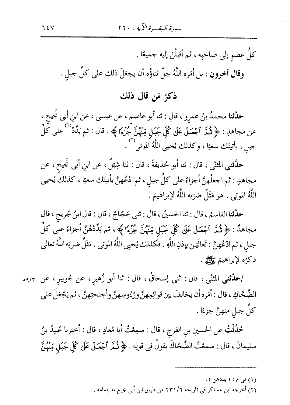 حَدَّثَنِي الْمُثَنَّى، قَالَ: ثني إِسْحَاقُ، قَالَ: ثنا أَبُو زُهَيْرٍ، عَنْ جُوَيْبِرٍ، عَنِ الضَّحَّاكِ، قَالَ: «أَمَرَهُ أَنْ §يُخَالِفَ بَيْنَ قَوَائِمِهِنَّ وَرُءُوسِهِنَّ وَأَجْنِحَتِهِنَّ، ثُمَّ يَجْعَلَ عَلَى كُلِّ جَبَلٍ مِنْهُنَّ جُزْءًا» حُدِّثْتُ عَنِ الْحُسَيْنِ بْنِ الْفَرَجِ، قَالَ: سَمِعْتُ أَبَا مُعَاذٍ، قَالَ: أَخْبَرَنَا عُبَيْدٌ، قَالَ: سَمِعْتُ الضَّحَّاكَ يَقُولُ فِي قَوْلِهِ: {ثُمَّ اجْعَلْ عَلَى كُلِّ جَبَلٍ مِنْهُنَّ