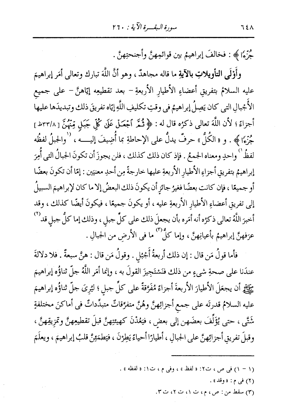 جُزْءًا} [البقرة: 260] «فَخَالَفَ إِبْرَاهِيمُ بَيْنَ قَوَائِمِهِنَّ وَأَجْنِحَتِهِنَّ» وَأَوْلَى التَّأْوِيلَاتِ بِالْآيَةِ مَا قَالَهُ مُجَاهِدٌ، وَهُوَ أَنَّ اللَّهَ تَعَالَى ذِكْرُهُ أَمَرَ إِبْرَاهِيمَ بَتَفْرِيقِ أَعْضَاءِ الْأَطْيَارِ الْأَرْبَعَةِ بَعْدَ تَقْطِيعِهِ إِيَّاهُنَّ عَلَى جَمِيعِ الْأَجْبَالِ الَّتِي كَانَ يَصِلُ إِبْرَاهِيمُ فِي وَقْتِ تَكْلِيفِ اللَّهِ إِيَّاهُ تَفْرِيقَ ذَلِكَ وَتَبْدِيدَهَا عَلَيْهَا أَجْزَاءً، لِأَنَّ اللَّهَ تَعَالَى ذِكْرُهُ قَالَ لَهُ: {ثُمَّ اجْعَلْ عَلَى كُلِّ جَبَلٍ مِنْهُنَّ جُزْءًا} [البقرة: 260] وَالْكُلُّ حَرْفٌ يَدُلُّ عَلَى الْإِحَاطَةِ بِمَا أُضِيفَ إِلَيْهِ لَفْظُهُ وَاحِدٌ وَمَعْنَاهُ الْجَمْعُ، فَإِذَا كَانَ ذَلِكَ كَذَلِكَ فَلَنْ يَجُوزَ أَنْ تَكُونَ الْجِبَالُ الَّتِي أَمَرَ اللَّهُ إِبْرَاهِيمَ بِتَفْرِيقِ أَجْزَاءِ الْأَطْيَارِ الْأَرْبَعَةِ عَلَيْهَا خَارِجَةً مِنْ أَحَدِ مَعْنَيَيْنِ: إِمَّا أَنْ تَكُونَ بَعْضًا أَوْ جَمِيعًا؛ فَإِنْ كَانَتْ بَعْضًا فَغَيْرُ جَائِزٍ أَنْ يَكُونَ ذَلِكَ الْبَعْضُ إِلَّا مَا كَانَ لِإِبْرَاهِيمَ السَّبِيلُ إِلَى تَفْرِيقِ أَعْضَاءِ الْأَطْيَارِ الْأَرْبَعَةِ عَلَيْهِ، أَوْ يَكُونَ جَمِيعًا، فَيَكُونَ أَيْضًا كَذَلِكَ، وَقَدْ أَخْبَرَ اللَّهُ تَعَالَى ذِكْرُهُ أَنَّهُ أَمَرَهُ بِأَنْ يَجْعَلَ ذَلِكَ عَلَى كُلِّ جَبَلٍ، وَذَلِكَ إِمَّا كُلُّ جَبَلٍ وَقَدْ عَرَفَهُنَّ إِبْرَاهِيمُ بِأَعْيَانِهِنَّ، وَإِمَّا مَا فِي الْأَرْضِ مِنَ الْجِبَالِ. فَأَمَّا قَوْلُ مَنْ قَالَ: إِنَّ ذَلِكَ أَرْبَعَةُ أَجْبُلٍ، وَقَوْلُ مَنْ قَالَ: هُنَّ سَبْعَةٌ؛ فَلَا دَلَالَةَ عِنْدَنَا عَلَى صِحَّةِ شَيْءٍ مِنْ ذَلِكَ فَنَسْتَجِيزُ الْقَوْلَ بِهِ، وَإِنَّمَا أَمَرَ اللَّهُ إِبْرَاهِيمَ صَلَّى اللهُ عَلَيْهِ وَسَلَّمَ أَنْ يَجْعَلَ الْأَطْيَارَ الْأَرْبَعَةَ أَجْزَاءً مُتَفَرِّقَةً عَلَى كُلِّ جَبَلٍ لِيُرِيَ إِبْرَاهِيمَ قُدْرَتَهُ عَلَى جَمْعِ أَجْزَائِهِنَّ وَهُنَّ مُتَفَرِّقَاتٍ مُتَبَدِّدَاتٍ فِي أَمَاكِنَ مُخْتَلِفَةٍ شَتَّى، حَتَّى يُؤَلِّفَ بَعْضَهُنَّ إِلَى بَعْضٍ، فَيَعُدْنَ كَهَيْئَتِهِنَّ قَبْلَ تَقْطِيعِهِنَّ وَتَمْزِيقِهِنَّ وَقَبْلَ تَفْرِيقِ أَجْزَائِهِنَّ عَلَى الْجِبَالِ أَطْيَارًا أَحْيَاءً يَطِرْنَ، فَيَطْمَئِّنَ قَلْبُ إِبْرَاهِيمَ وَيَعْلَمَ