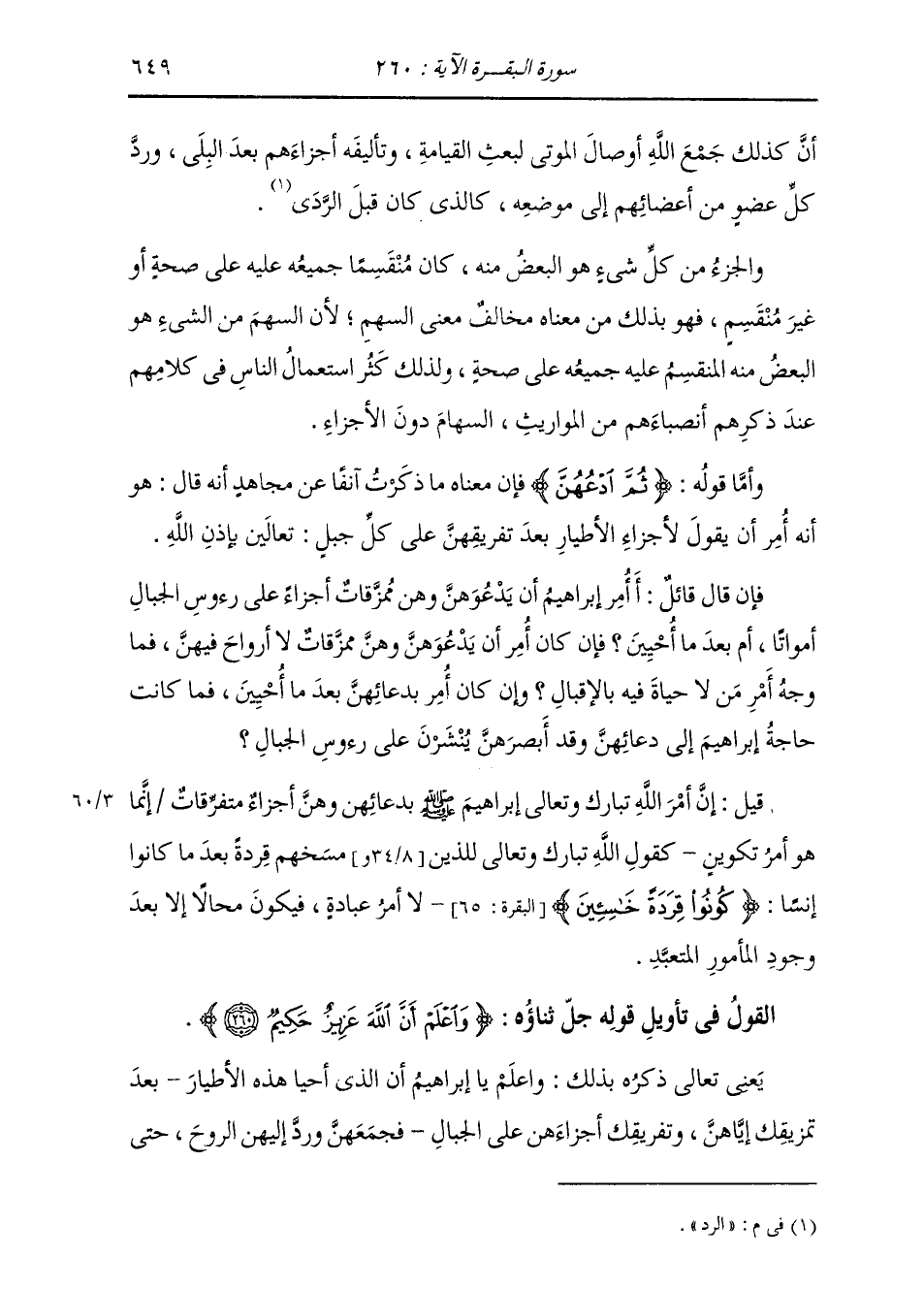 أَنَّ كَذَلِكَ يَجْمَعُ اللَّهُ أَوْصَالَ الْمَوْتَى لَبَعْثِ الْقِيَامَةِ، وَتَأْلِيفَهُ أَجْزَاءَهُمْ بَعْدَ الْبِلَى وَرَدَّ كُلِّ عُضْوٍ مِنْ أَعْضَائِهِمْ إِلَى مَوْضِعِهِ كَالَّذِي كَانَ قَبْلَ الرَّدِّ. وَالْجُزْءُ مِنْ كُلِّ شَيْءٍ هُوَ الْبَعْضُ مِنْهُ كَانَ مُنْقَسِمًا جَمِيعُهُ عَلَيْهِ عَلَى صِحَّةٍ أَوْ غَيْرَ مُنْقَسِمٍ، فَهُوَ بِذَلِكَ مِنْ مَعْنَاهُ مُخَالِفٌ مَعْنَى السَّهْمِ؛ لِأَنَّ السَّهْمَ مِنَ الشَّيْءِ: هُوَ الْبَعْضُ الْمُنْقَسِمُ عَلَيْهِ جَمِيعُهُ عَلَى صِحَّةٍ، وَلِذَلِكَ كَثُرَ اسْتِعْمَالُ النَّاسِ فِي كَلَامِهِمْ عِنْدَ ذِكْرِهِمْ أَنْصِبَاءَهُمْ مِنَ الْمَوَارِيثِ السِّهَامَ دُونَ الْأَجْزَاءِ. وَأَمَّا قَوْلُهُ: {ثُمَّ ادْعُهُنَّ} [البقرة: 260] فَإِنَّ مَعْنَاهُ مَا ذَكَرْتُ آنِفًا عَنْ مُجَاهِدٍ أَنَّهُ قَالَ: هُوَ أَنَّهُ أُمِرَ أَنْ يَقُولَ لِأَجْزَاءِ الْأَطْيَارِ بَعْدَ تَفْرِيقِهِنَّ عَلَى كُلِّ جَبَلٍ تَعَالَيْنَ بِإِذْنِ اللَّهِ. فَإِنْ قَالَ قَائِلٌ: أُمِرَ إِبْرَاهِيمُ أَنْ يَدَعُوَهُنَّ وَهُنَّ مُمَزَّقَاتٌ أَجْزَاءً عَلَى رُءُوسِ الْجِبَالِ أَمْوَاتًا، أَمْ بَعْدَ مَا أُحْيِينَ؟ فَإِنْ كَانَ أُمِرَ أَنْ يَدَعُوَهُنَّ وَهُنَّ مُمَزَّقَاتٌ لَا أَرْوَاحَ فِيهِنَّ، فَمَا وَجْهُ أَمْرِ مَنْ لَا حَيَاةَ فِيهِ بِالْإِقْبَالِ؟ وَإِنْ كَانَ أُمِرَ بِدُعَائِهِنَّ بَعْدَ مَا أُحْيِينَ، فَمَا كَانَتْ حَاجَةُ إِبْرَاهِيمَ إِلَى دُعَائِهِنَّ وَقَدْ أَبْصَرَهُنَّ يُنْشَرْنَ عَلَى رُءُوسِ الْجِبَالِ؟ قِيلَ: إِنَّ أَمْرَ اللَّهَ تَعَالَى ذِكْرُهُ إِبْرَاهِيمَ صَلَّى اللهُ عَلَيْهِ وَسَلَّمَ بِدُعَائِهِنَّ وَهُنَّ أَجْزَاءٌ مُتَفَرِّقَاتٌ إِنَّمَا هُوَ أَمْرُ تَكْوِينٍ، كَقَوْلِ اللَّهِ لِلَّذِينَ مَسَخَهُمْ قِرَدَةً بَعْدَ مَا كَانُوا إِنْسًا: {كُونُوا قِرَدَةً خَاسِئِينَ} [البقرة: 65] لَا أَمْرَ عِبَادَةٍ، فَيَكُونُ مُحَالًا إِلَّا بَعْدَ وُجُودِ الْمَأْمُورِ الْمُتَعَبِّدِ