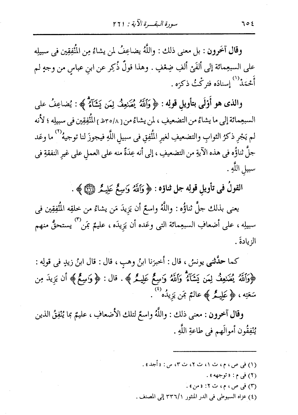 كَمَا: حَدَّثَنِي يُونُسُ، قَالَ: أَخْبَرَنَا ابْنُ وَهْبٍ، قَالَ: قَالَ ابْنُ زَيْدٍ فِي قَوْلِهِ: {§وَاللَّهُ يُضَاعِفُ لِمَنْ يَشَاءُ وَاللَّهُ وَاسِعٌ عَلِيمٌ} [البقرة: 261] قَالَ: «وَاسِعٌ أَنْ يَزِيدَ مِنْ سَعَتِهِ، عَلِيمٌ عَالِمٌ بِمَنْ يَزِيدُهُ» وَقَالَ آخَرُونَ: مَعْنَى ذَلِكَ: وَاللَّهُ وَاسِعٌ لِتِلْكَ الْأَضْعَافِ، عَلِيمٌ بِمَا يُنْفِقُ الَّذِينَ يُنْفِقُونَ أَمْوَالَهُمْ فِي طَاعَةِ اللَّهِ